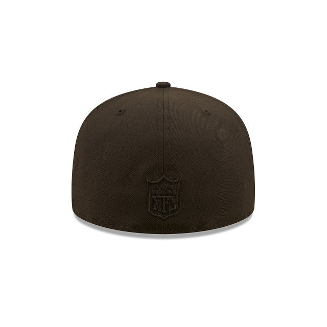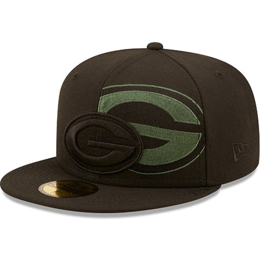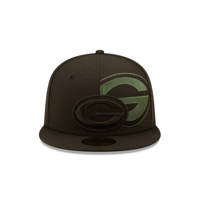 The Green Bay Packers Logo Feature 59FIFTY Fitted Cap has an embroidered blackout Packers logo overlayed with a team colored feature logo at the front panels, and a blackout NFL Shield at the rear. Additional details include a green undervisor.