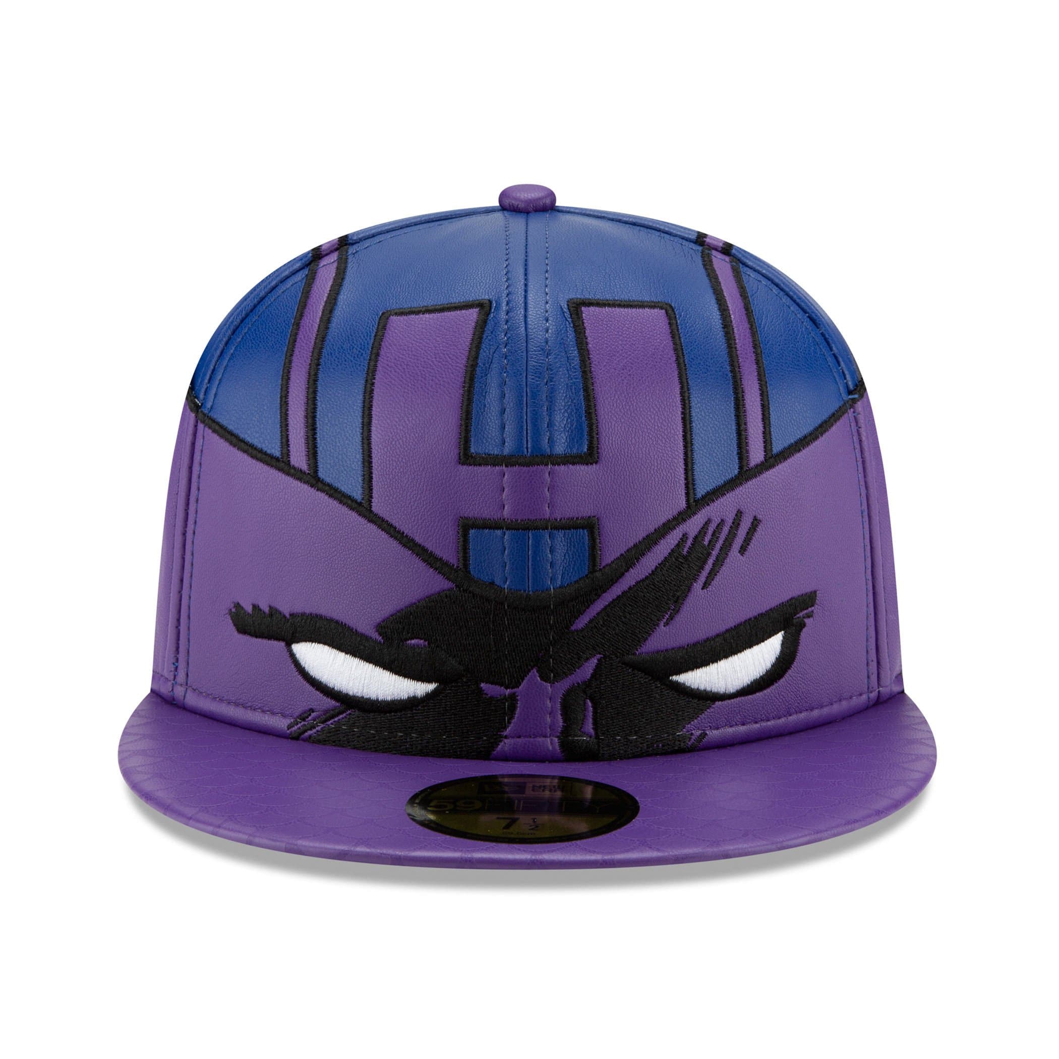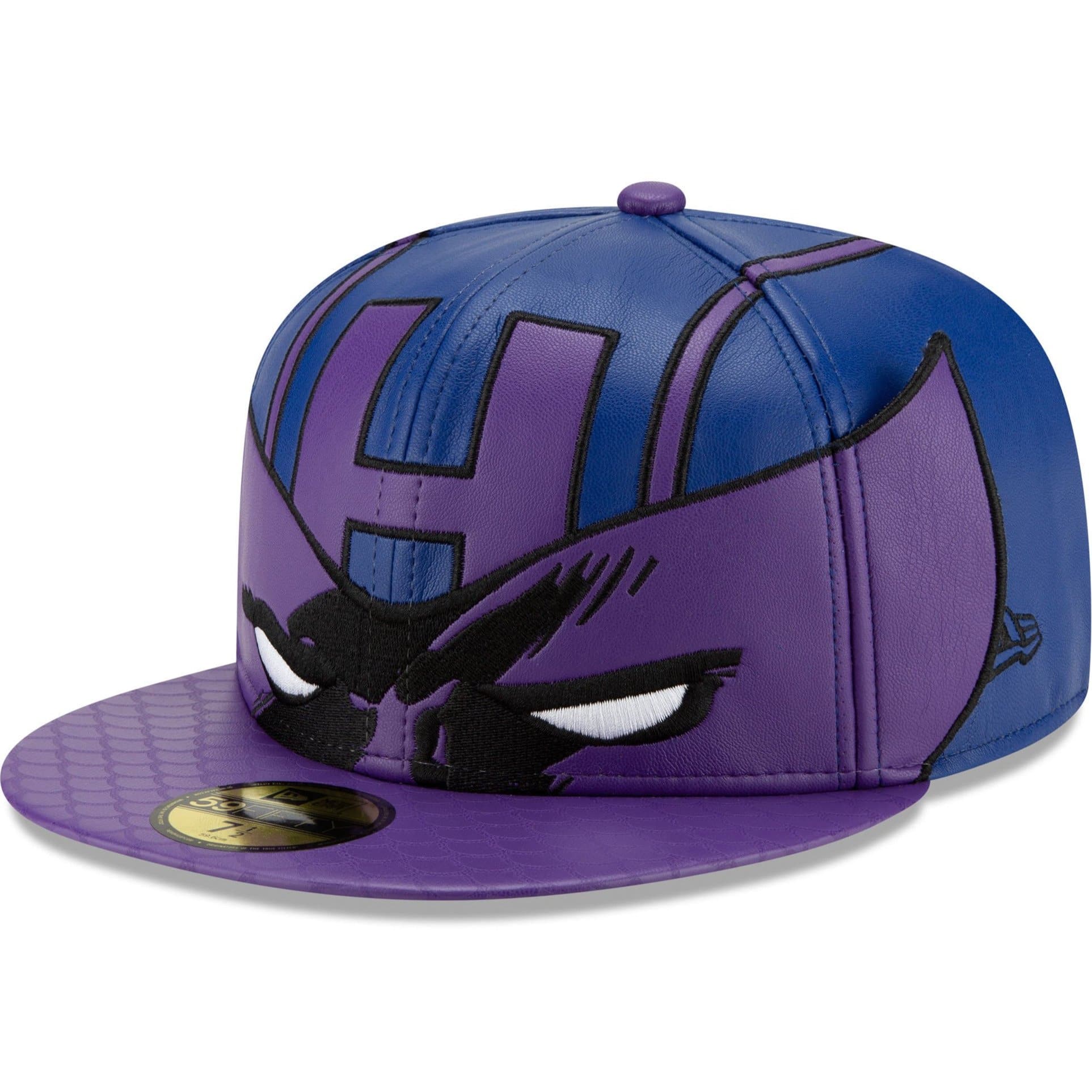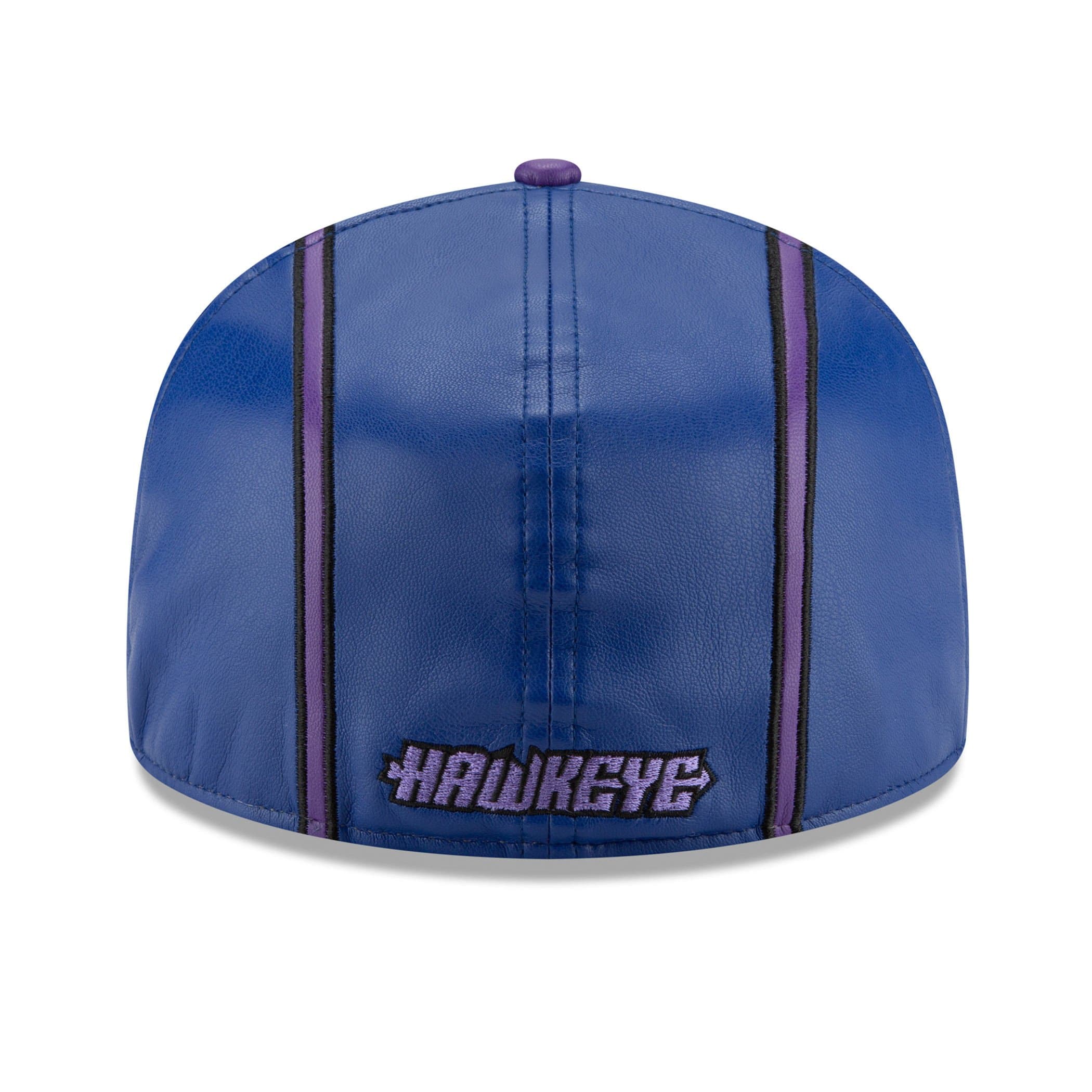 The New Era Hawkeye Marvel Comics 59FIFTY fitted hat has a purple and blue colorway. The fitted hat features an up-close superhero Hawkeye mask design. The entire crown, squatchee button and flat bill of the fitted is made of leather.
