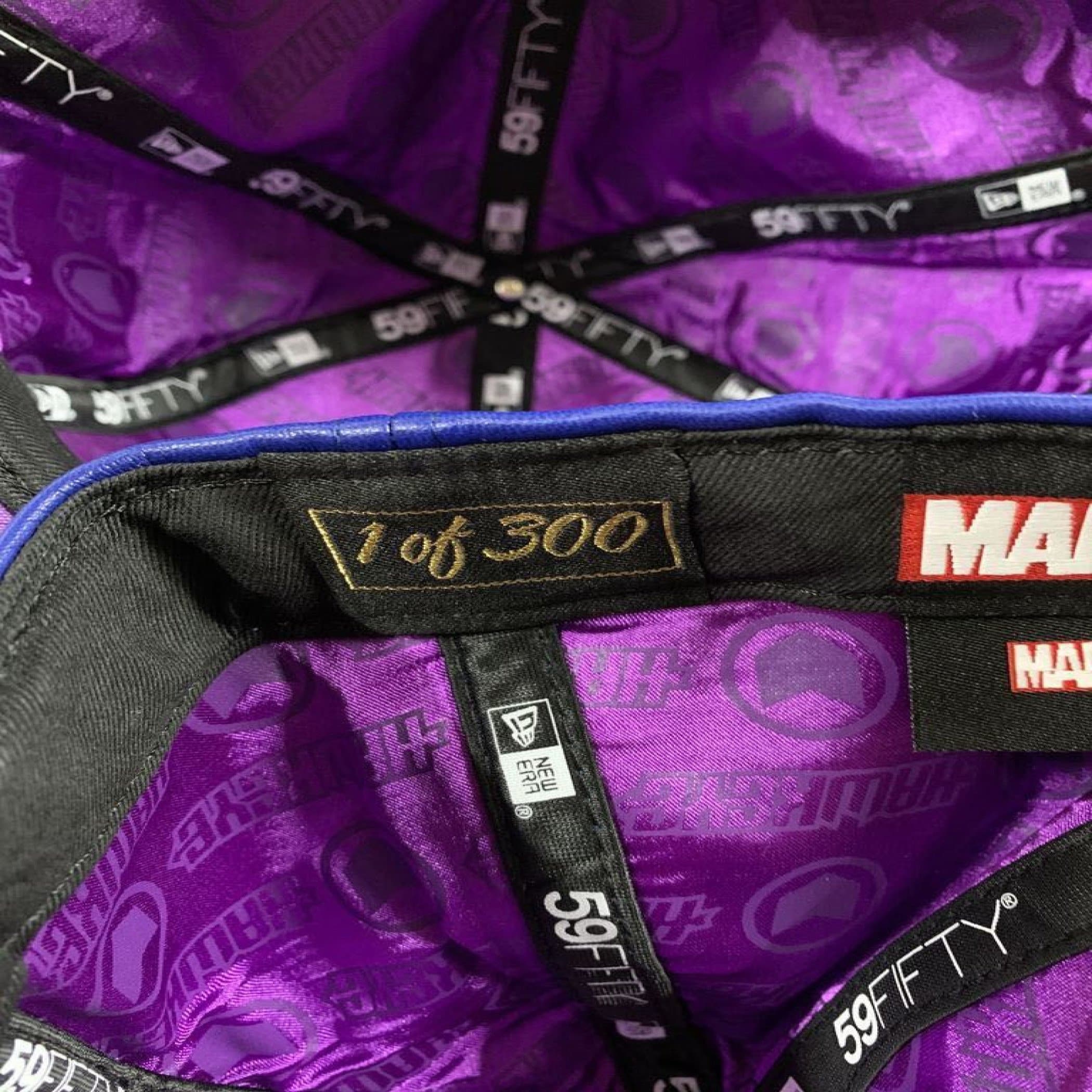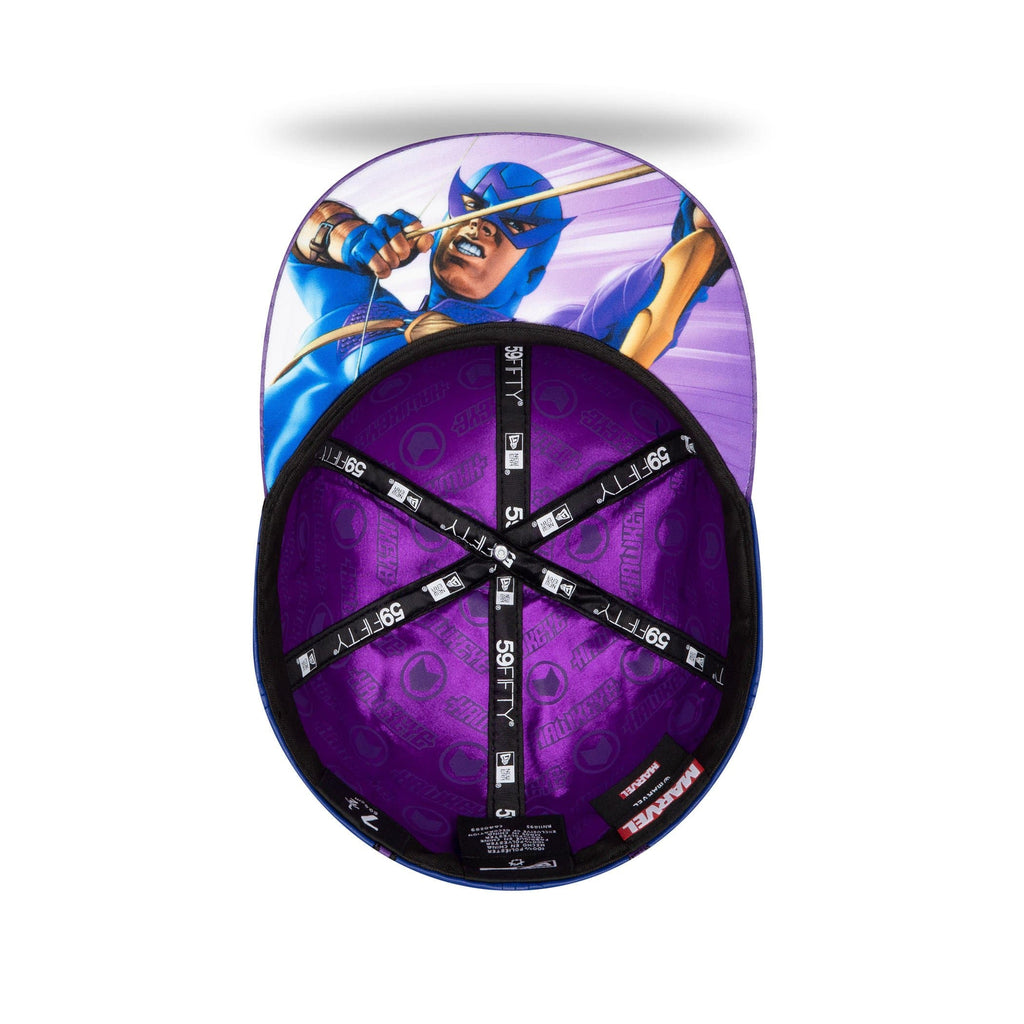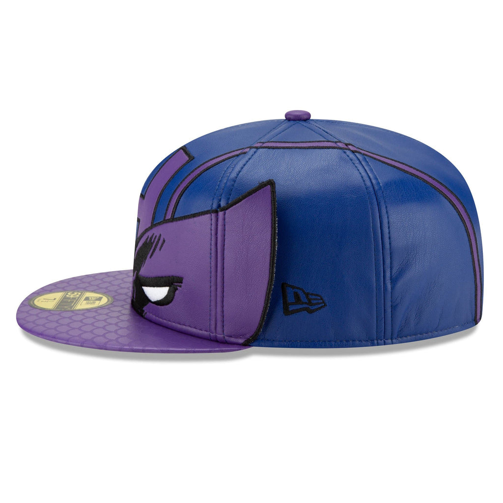 The New Era Hawkeye Marvel Comics 59FIFTY fitted hat has a purple and blue colorway. The fitted hat features an up-close superhero Hawkeye mask design. The entire crown, squatchee button and flat bill of the fitted is made of leather.