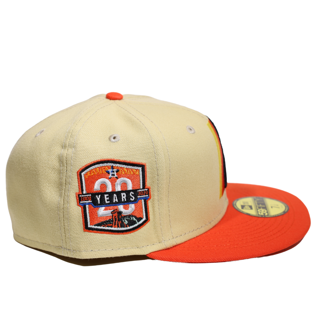 This New Era Houston Astros 20Th Anniversary 59FIFTY Fitted Hat has a six panel structured high crown and embroidered eyelets with a fabric squatchee button. The fitted cap has a flat bill with a sweatband. The front panel features the Houston Astros logo embroidery.