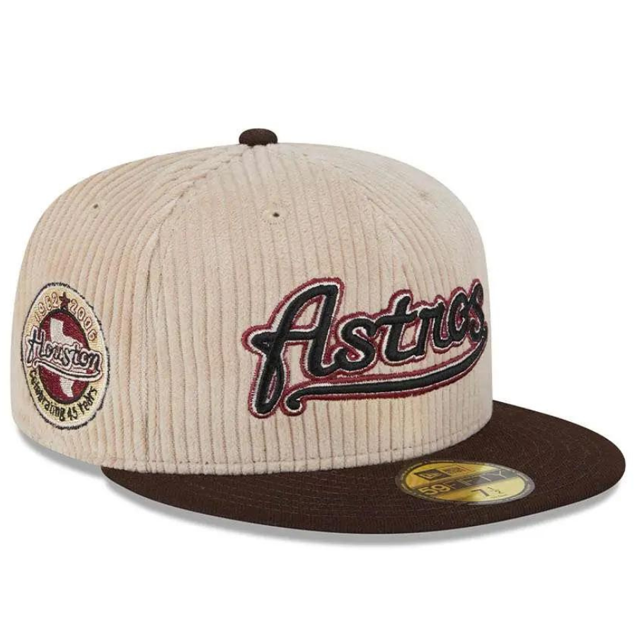 This Houston Astros fitted hat was released by Topperz Store. The fitted has a tan corduroy six panel structured high crown and embroidered eyelets with a dark brown fabric squatchee button. The fitted cap also has a dark brown flat bill with a green bottom undervisor and black sweatband. The front panel features the Houston Astros logo embroidery and a 45th Anniversary side patch embroidery on the right panel. The left panel of the fitted displays the New Era logo and the official MLB Batterman logo embroidery on the rear crown.