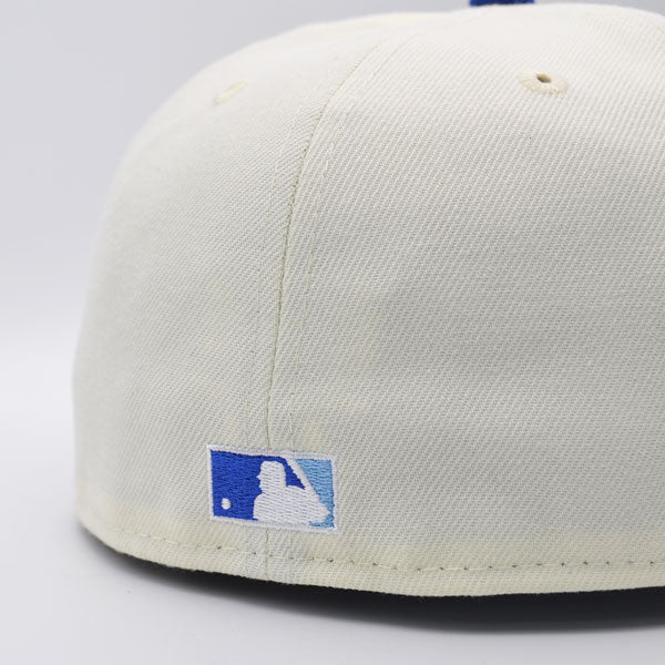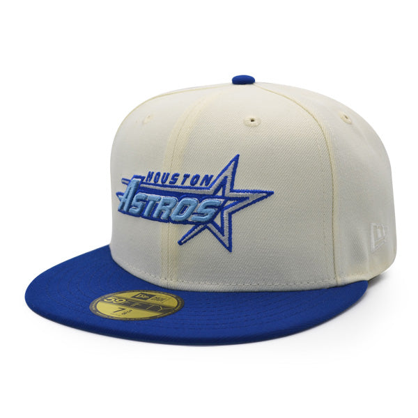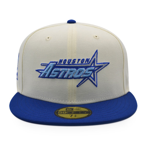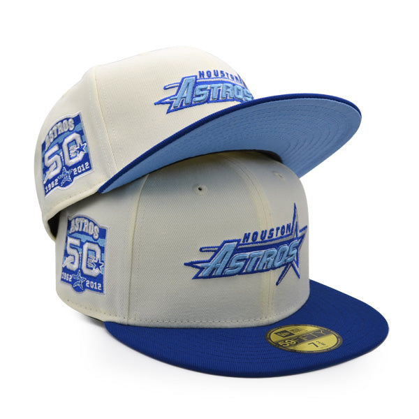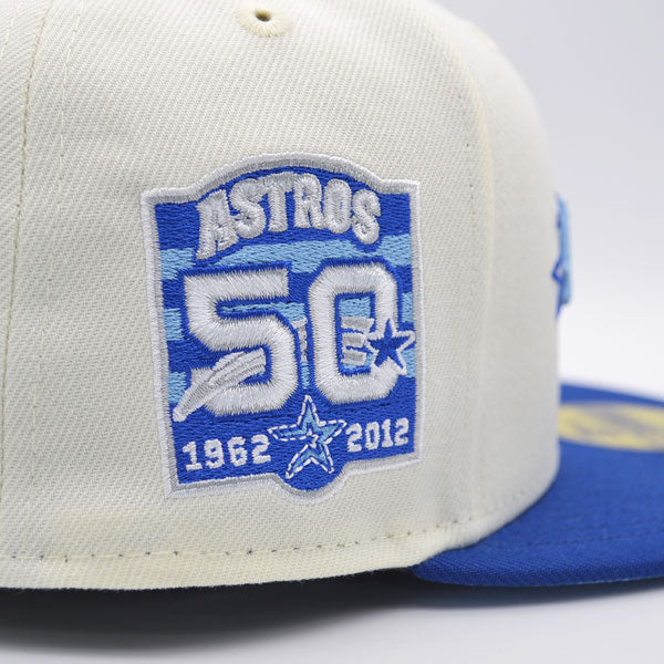 This New Era Houston Astros Chrome/Royal Blue 19620 2012 50th Anniversary 59FIFTY Fitted Hat was released by Hat Dreams. The fitted cap features a chrome and royal blue colorway. The front panel includes the Houston Astros logo embroidery. The left panel of the fitted displays the New Era logo and the official MLB insignia embroidered on the rear crown and a side patch on the right-wear side.