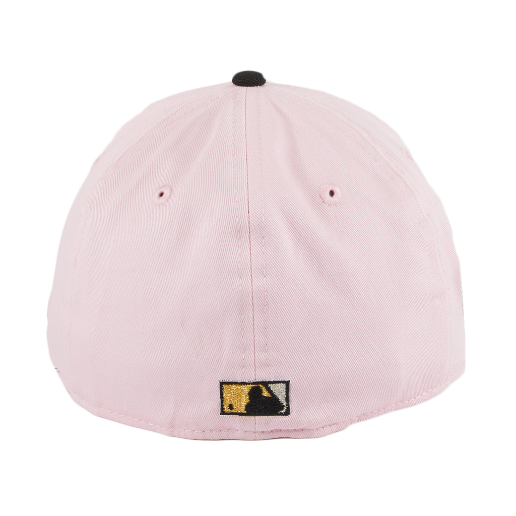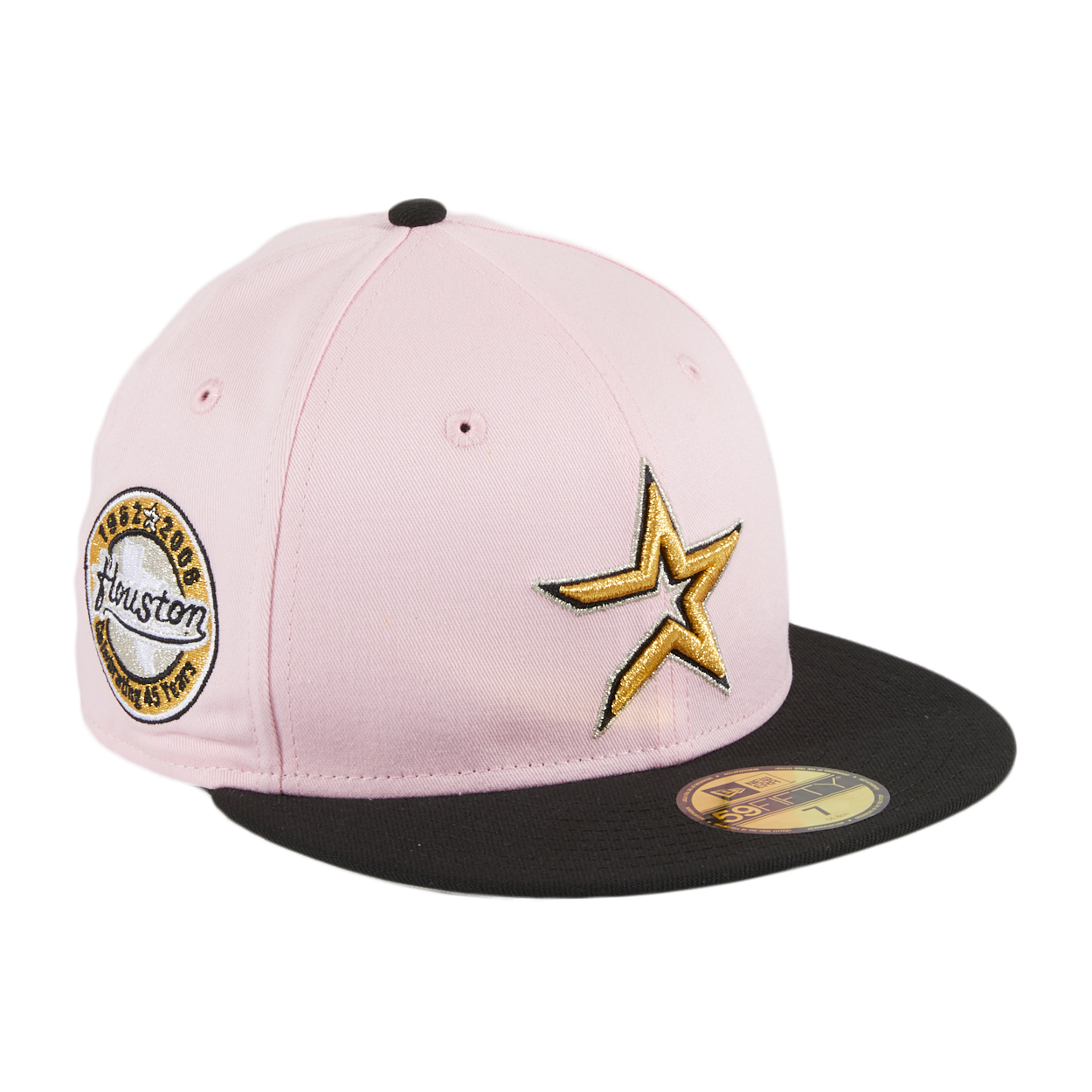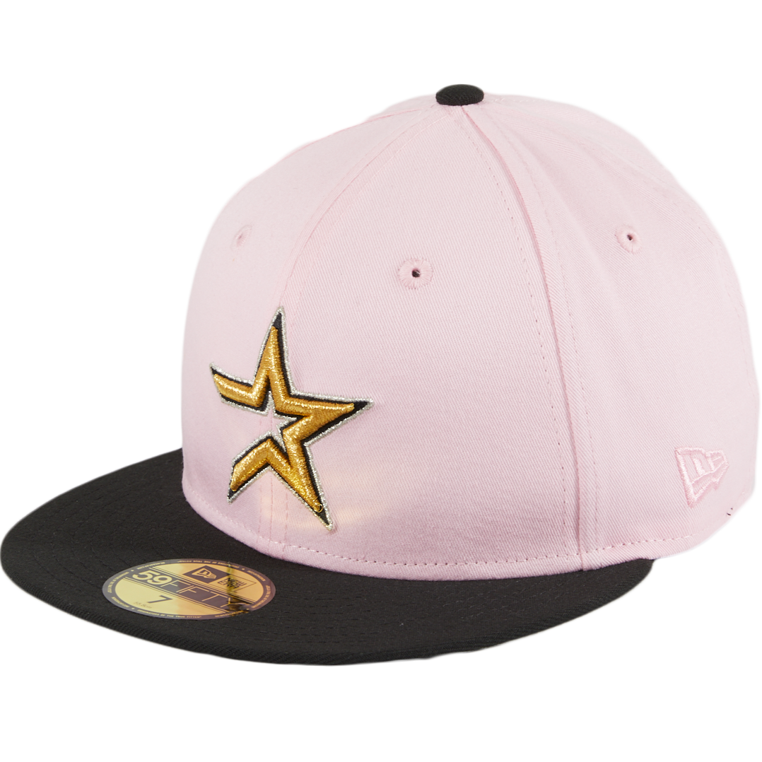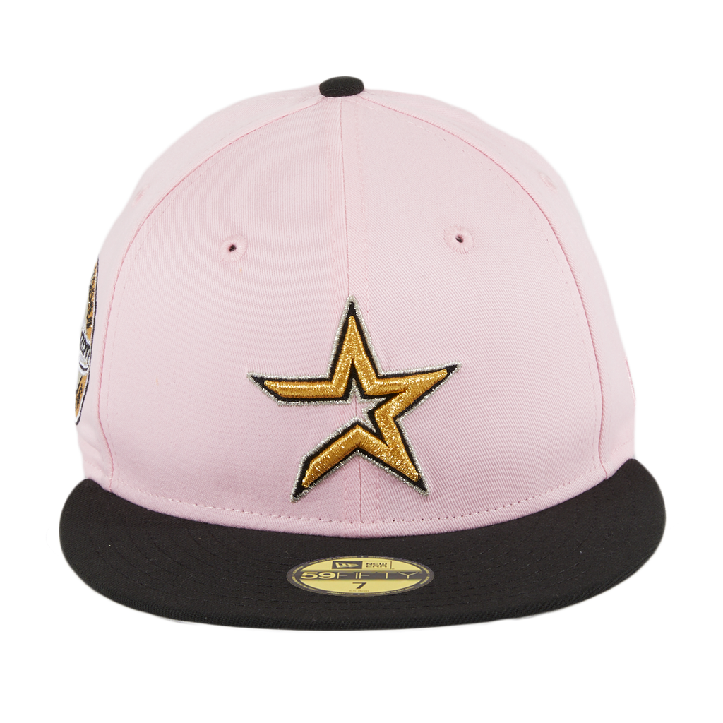 The New Era Houston Astros Heartthrob fitted hat is a Hat Club exclusive drop with a pink, black, grey and gold colorway. The fitted hat features a soft pink structured crown and a black fabric squatchee button and flat bill. The undervisor is light grey. The front panel features the MLB team logo and a side patch on the right panel.