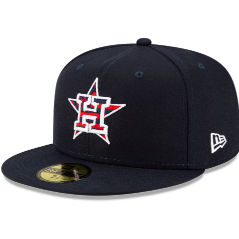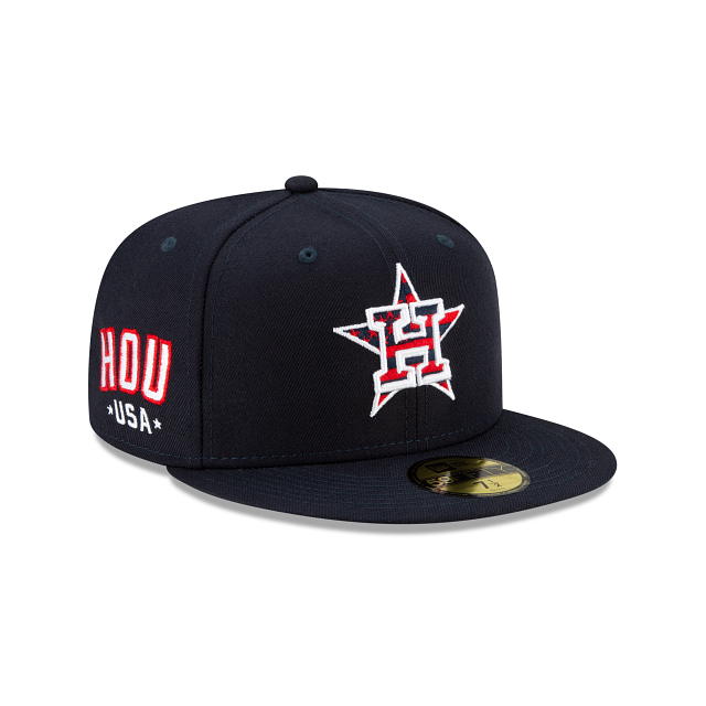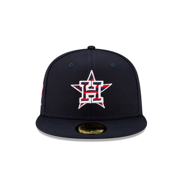Show your patriotism with the Houston Astros Independence Day 59FIFTY Fitted Cap featuring an intricate stars and stripes pattern embroidered within the Astros logo at the front panels with a city-specific logo embroidered at the right wear side and a matching MLB Batterman logo at the rear.