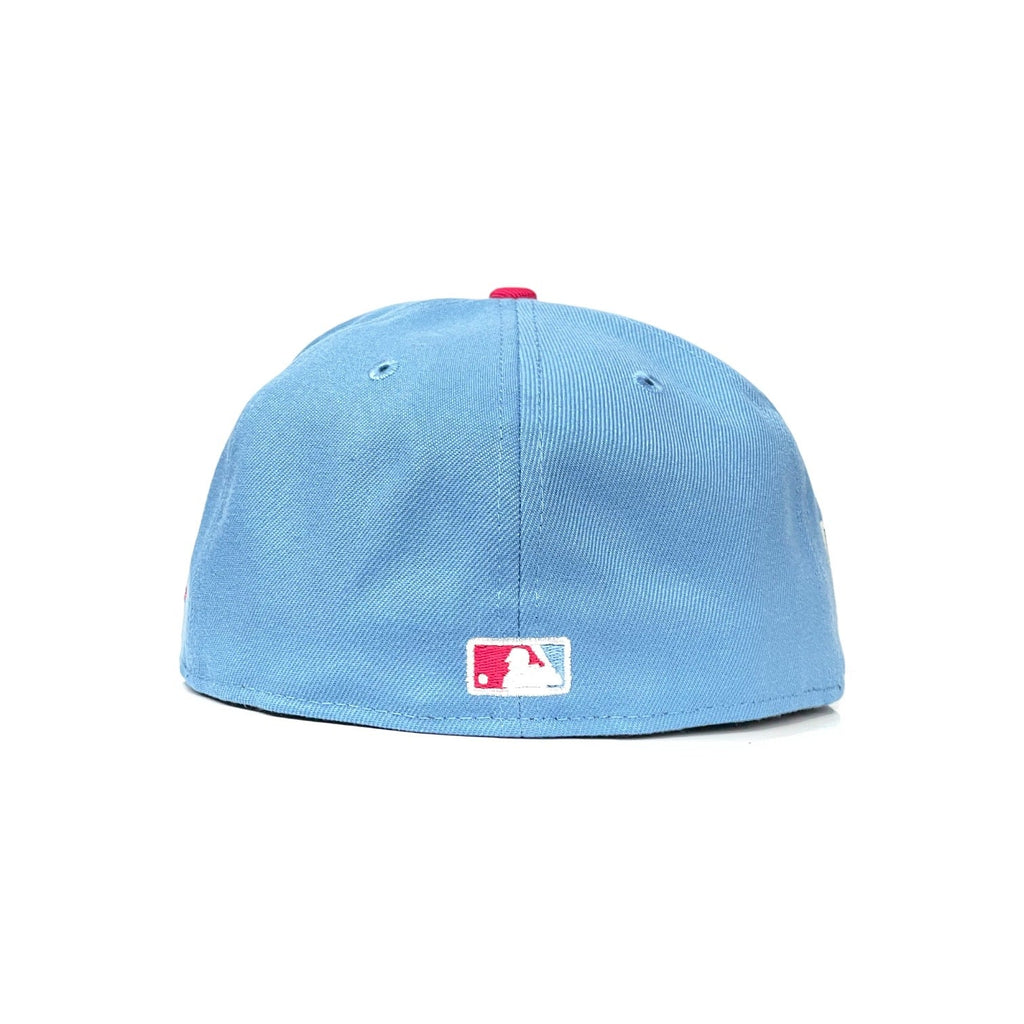 This Houston Astros fitted hat was released by Prociety. The fitted has a baby blue six panel structured high crown and embroidered eyelets with a hot pink fabric squatchee button. The flat bill of the cap is also hot pink with a grey undervisor and black sweatband. The front panel features the Houston Astros logo embroidery and a Mexican flag side patch embroidery on the right panel.