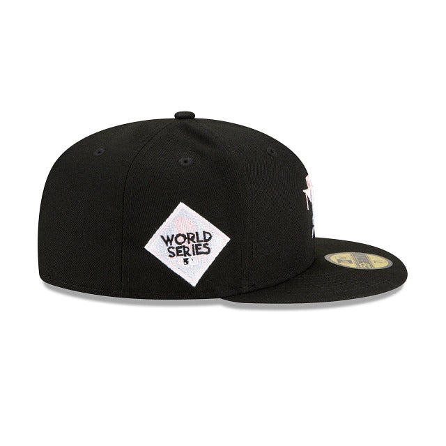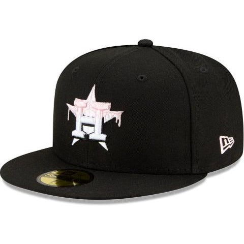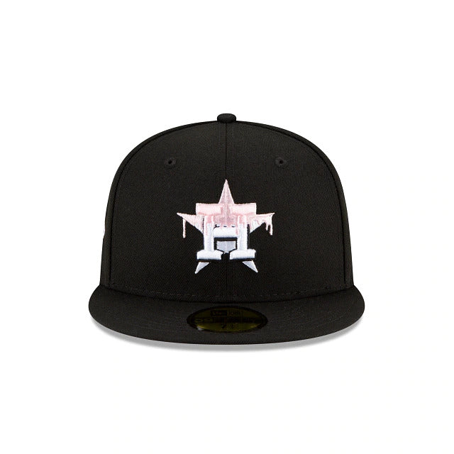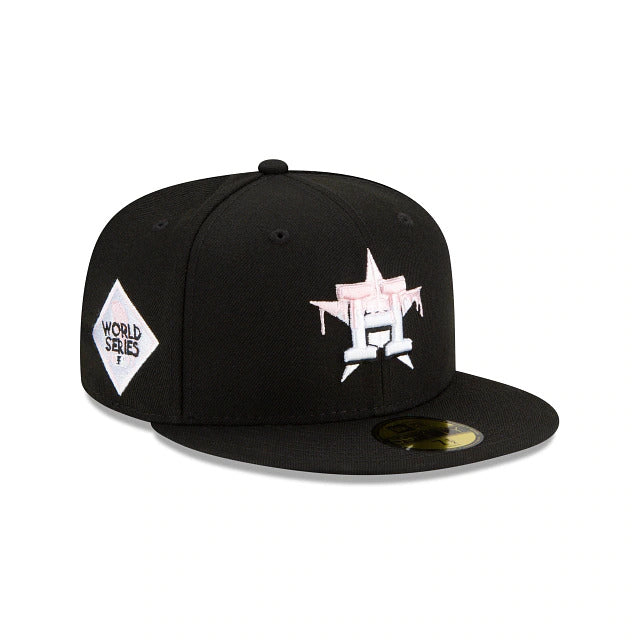 The Houston Astros Team Drip 59FIFTY Fitted Cap features the team embroidered logo with a pink drip detailing at the front panels with a World Series side patch at the right-wear side and the MLB Batterman logo at the rear. Additional details include a pink undervisor.
