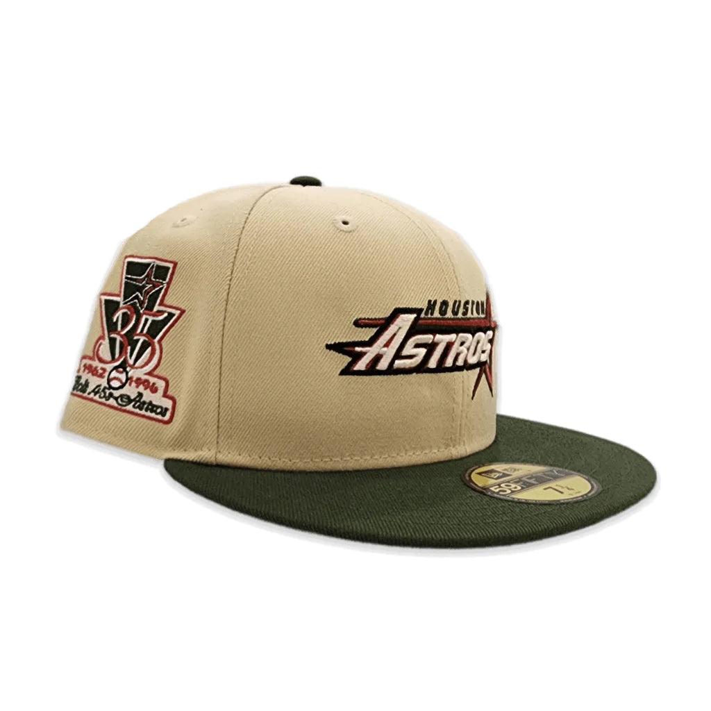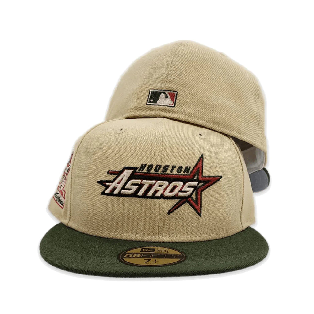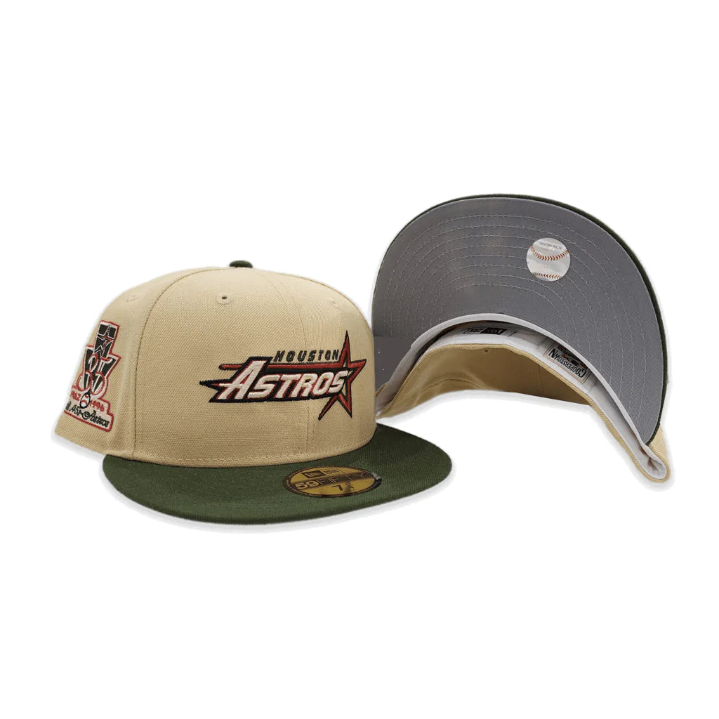 This New Era Houston Astros Vegas Gold/Olive Green 35 Great Years 59FIFTY Fitted Hat was released by Exclusive Fitted. The fitted has a vegas gold six panel structured high crown and embroidered eyelets with an olive green fabric squatchee button and flat bill. The fitted cap has a dark gray bottom undervisor with a white sweatband. The front panel features the Houston Astros logo embroidery and a side patch embroidered on the right panel. The left panel of the fitted displays the New Era logo and the official MLB logo embroidery on the rear crown.