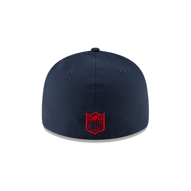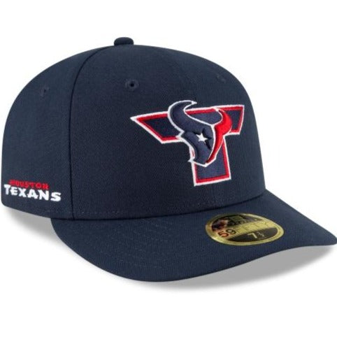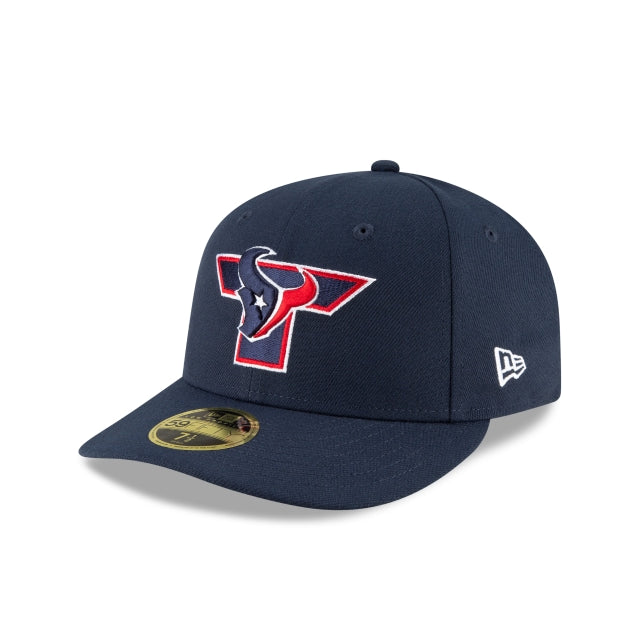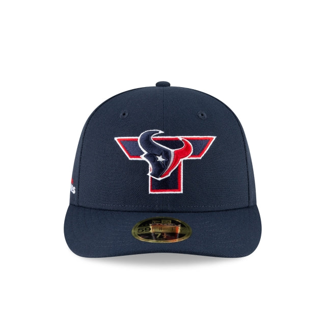 The Houston Texans Logo Mix Low Profile 59FIFTY Fitted Cap features a blend of Texans logos embroidered at the front panels with a team wordmark at the right-wear side and a team color NFL Shield at the rear. The undervisor of this cap matches the cap color.