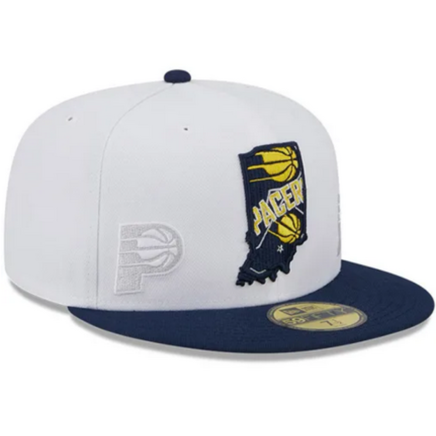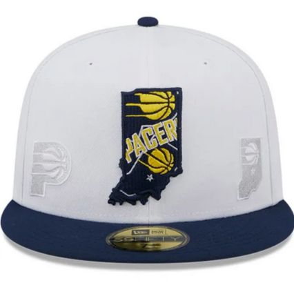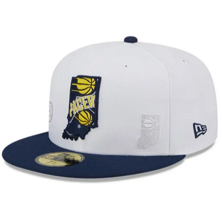 This New Era Indiana Pacers State 59FIFTY fitted hat has a white six panel structured high crown and embroidered eyelets with a navy fabric squatchee button and flat bill. The front panel features the Indiana Pacers logo embroidered inside a state logo graphic.