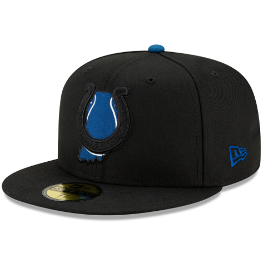 The State Logo Reflect Indianapolis Colts is a black on black with blue colorway. The entire fitted is midnight black including the 6 panels , eyelets and brim. The squatchee button located at the top and New Era logo on the left of the fitted is blue. The right side patch is black with blue colorway as well. The team logo is displayed on the front embroidered in black/white threads and behind the logo is the team state embroidered in blue threads with blue bottom undervisor. The official NFL shield is also embroidered in blue and black threads.