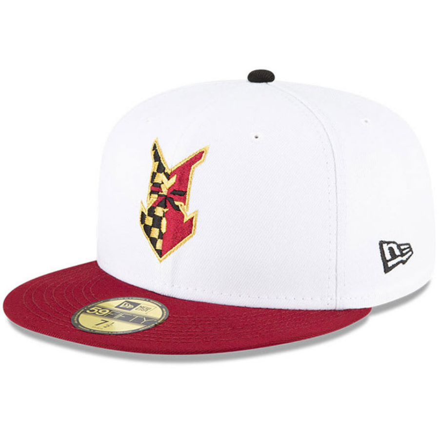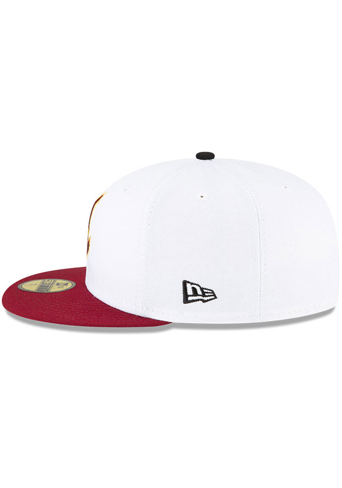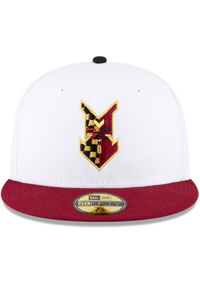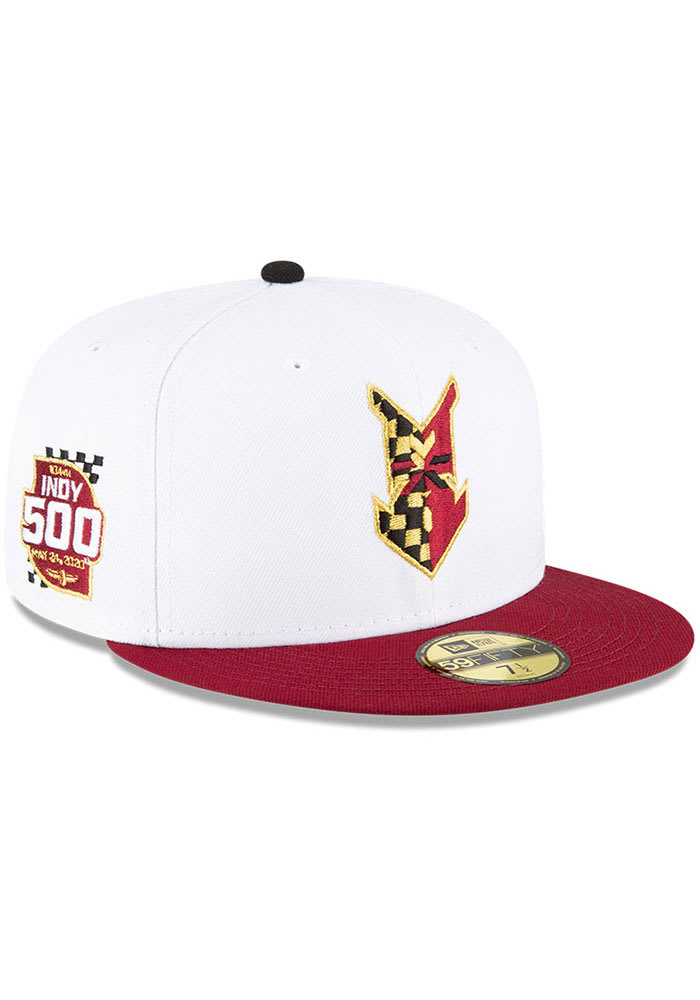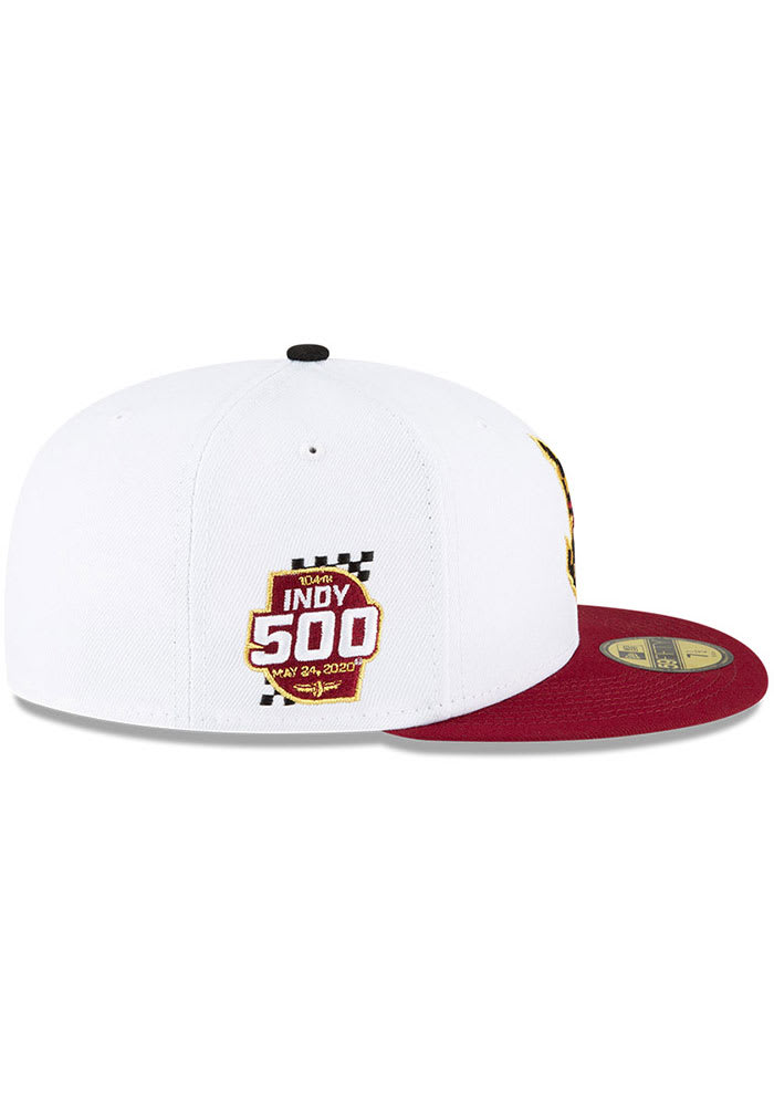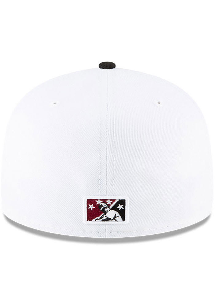 This New Era Indianapolis Indians 59FIFTY fitted hat has a white six panel structured high crown and embroidered eyelets with a black fabric squatchee button. The flat bill of the fitted is crimson. The front panel features the Indianapolis Indians logo embroidery and the official MiLB logo embroidered on the back of the crown.