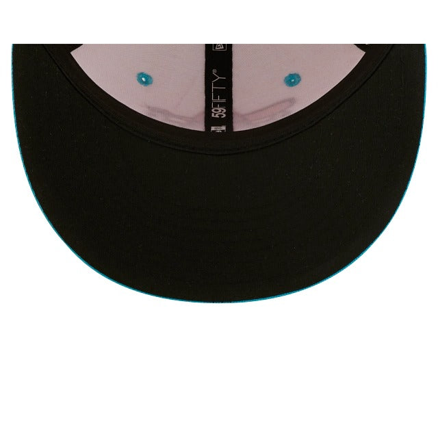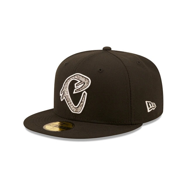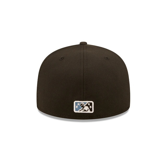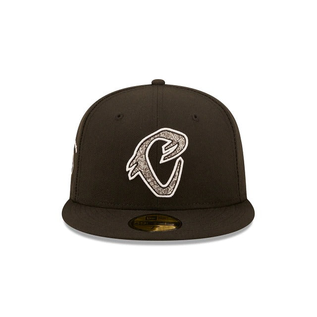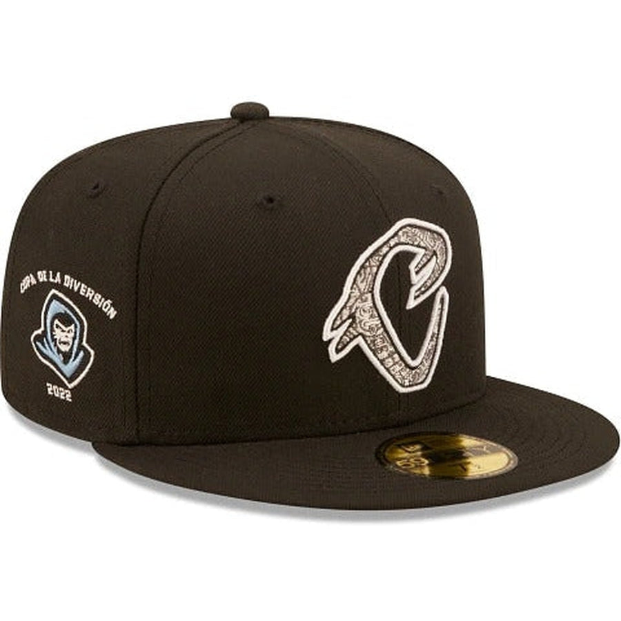 The Inland Empire 66ers Copa de la Diversion 59FIFTY Fitted Cap features an embroidered Copa De La Diversion themed 66ers logo at the front panels, a Copa patch at the right-wear side, and a matching MiLB Batterman logo at the rear.