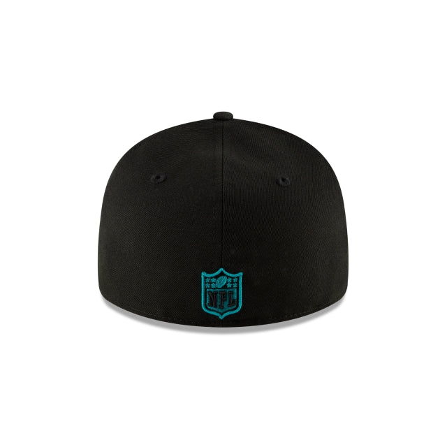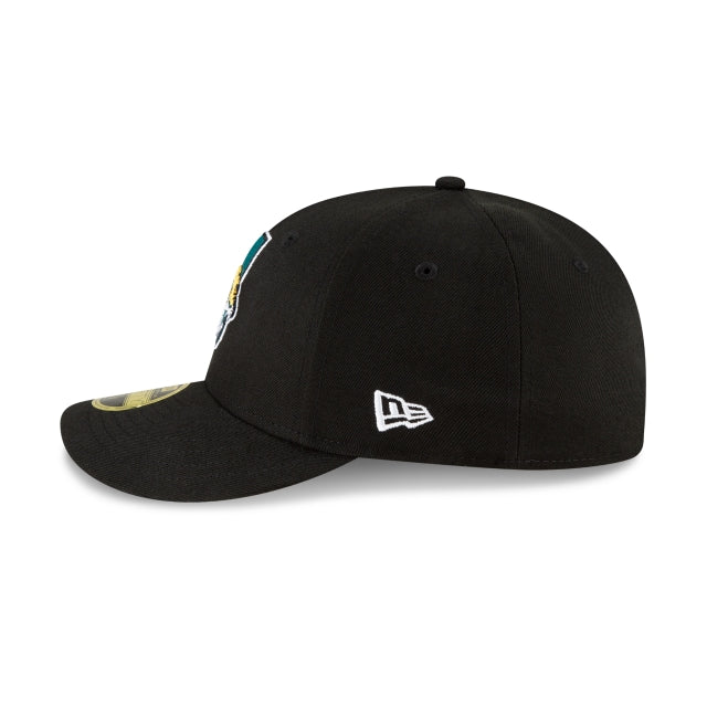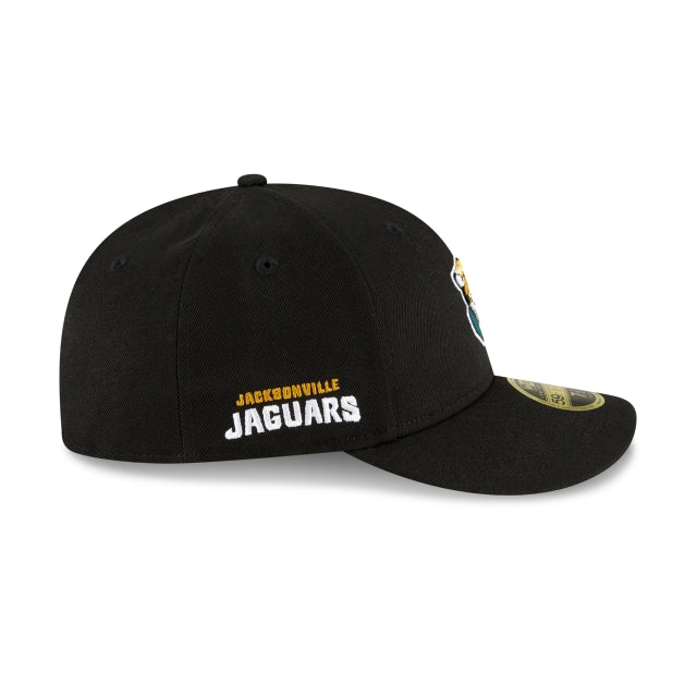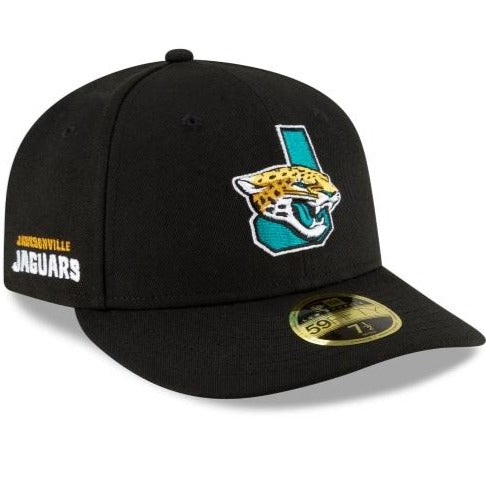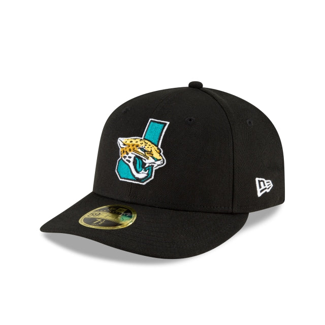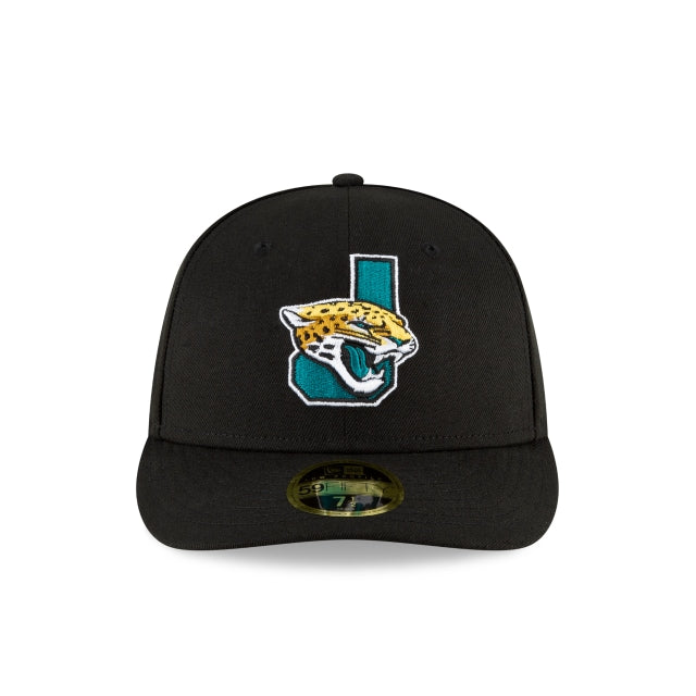 The Jacksonville Jaguars Logo Mix Low Profile 59FIFTY Fitted Cap features a blend of Jaguars logos embroidered at the front panels with a team wordmark at the right-wear side and a team color NFL Shield at the rear. The undervisor of this cap matches the cap color.