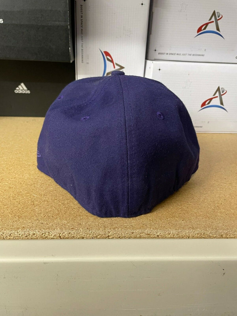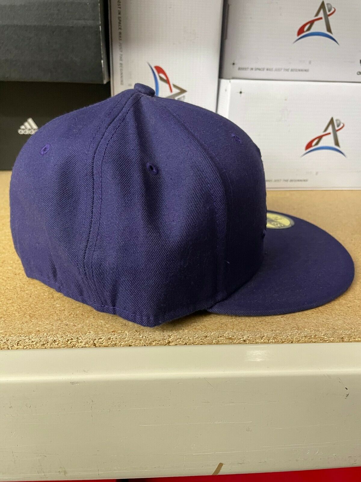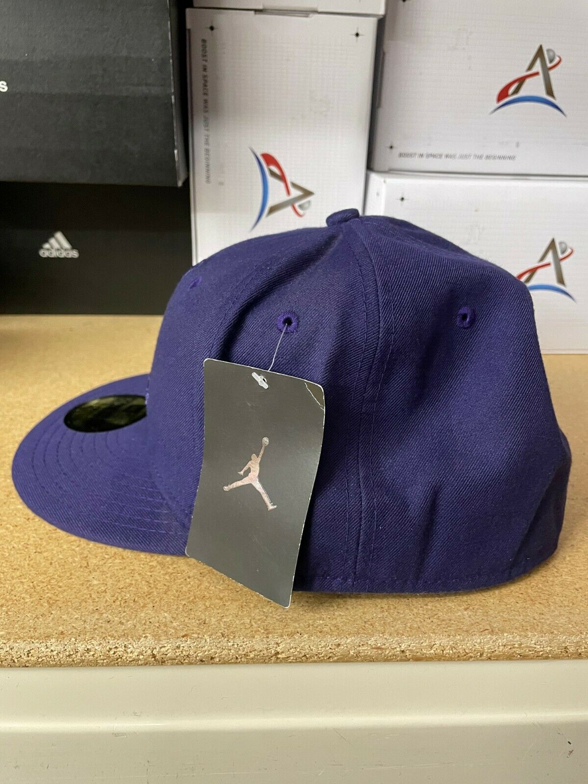 This New Era Air Jordan Jumpman fitted hat has an all purple colorway. The six panel structured high crown, embroidered eyelets and fabric squatchee button of the cap are all solid purple. The front panel features a purple embroidered jumpman logo. The undervisor of the fitted is also purple with a black sweatband. Great fitted for those who love Jordan and/or the color purple.