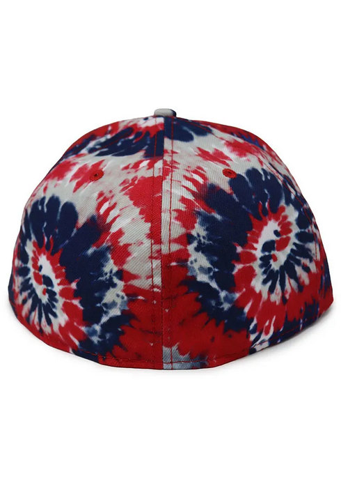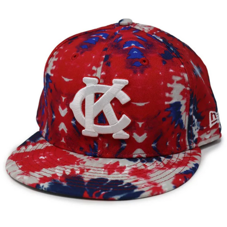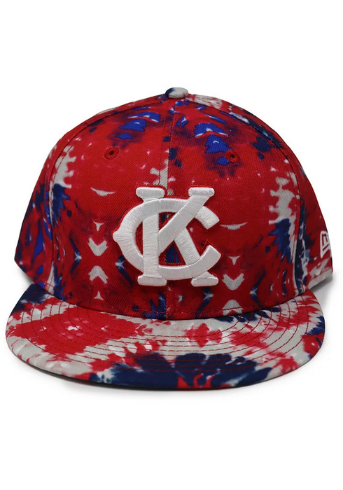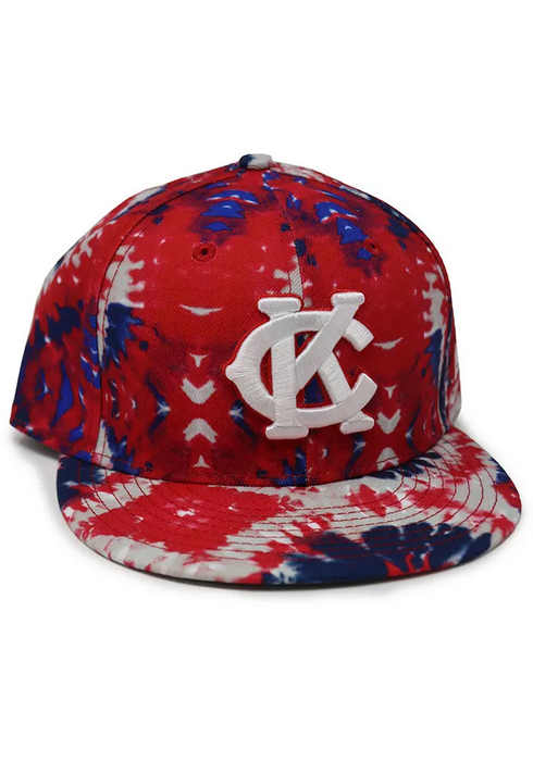 This New Era Kansas City Monarchs 59FIFTY fitted hat has a red tie dye six panel structured high crown and embroidered eyelets, flat bill and fabric squatchee button located at the top of the crown. Additional details include the Kansas City Monarchs logo embroidered in white stitching.