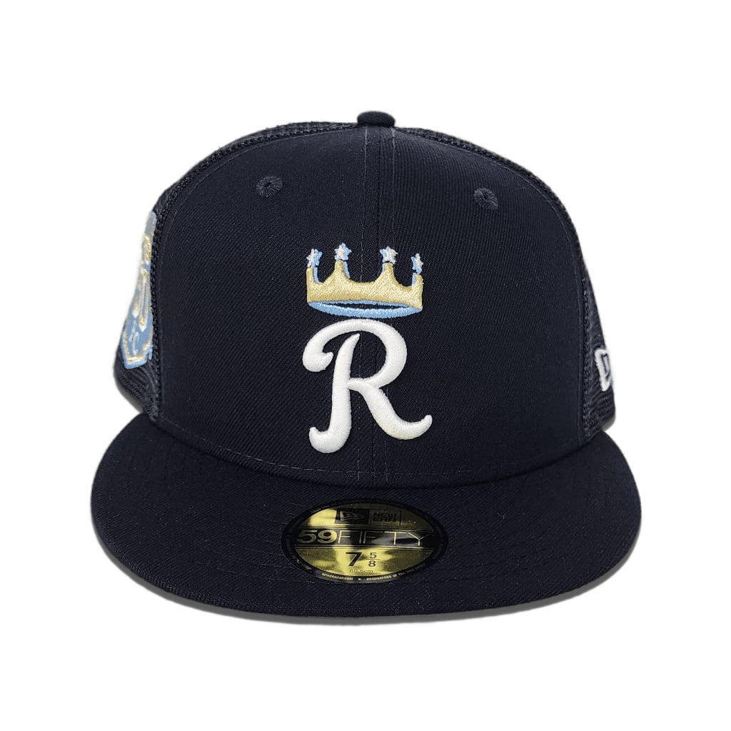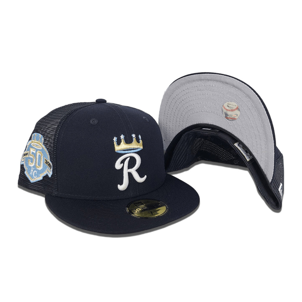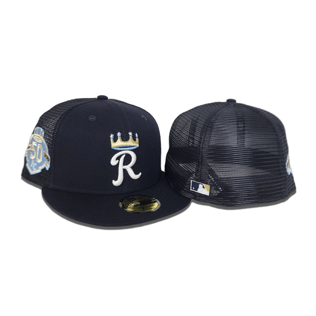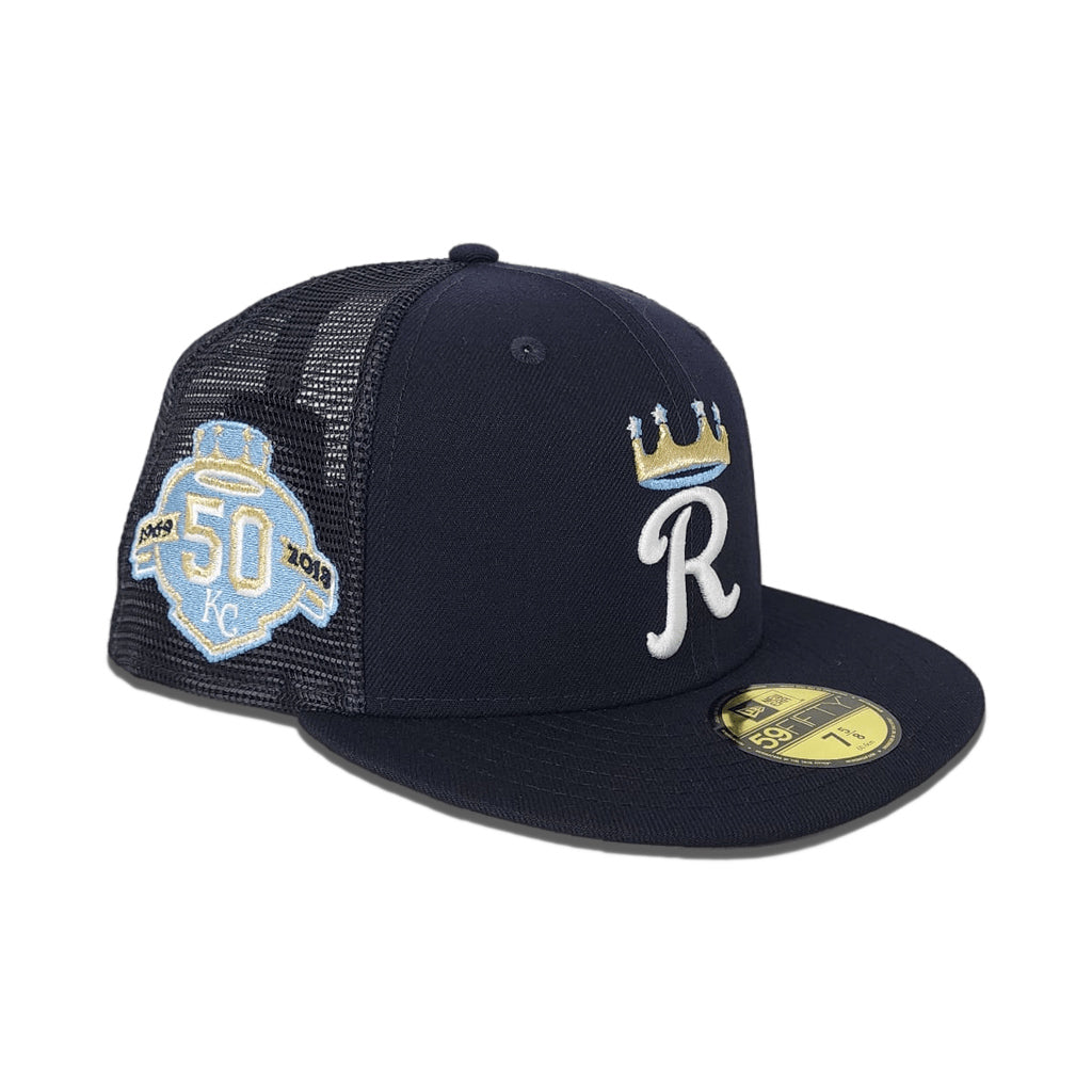 This Kansas City Royals 59FIFTY fitted hat was released by Exclusive Fitted. The fitted has a navy blue six panel structured high crown and embroidered eyelets, a mesh rear-crown known as the trucker style with a navy fabric squatchee button. The fitted cap also has a navy blue flat bill. The front panel features the Kansas City Royals logo embroidery and a 50th Anniversary side patch embroidery on the right panel. The left panel of the fitted displays the New Era logo and the official MLB Batterman logo embroidery on the rear crown.
