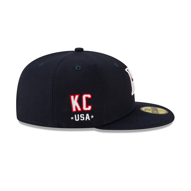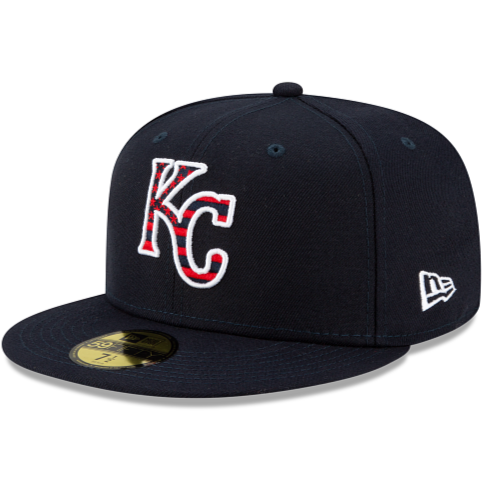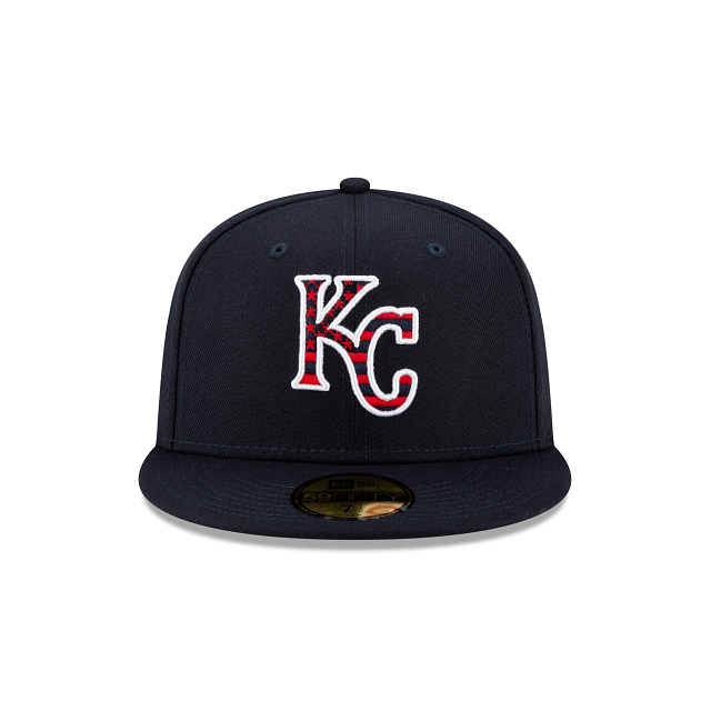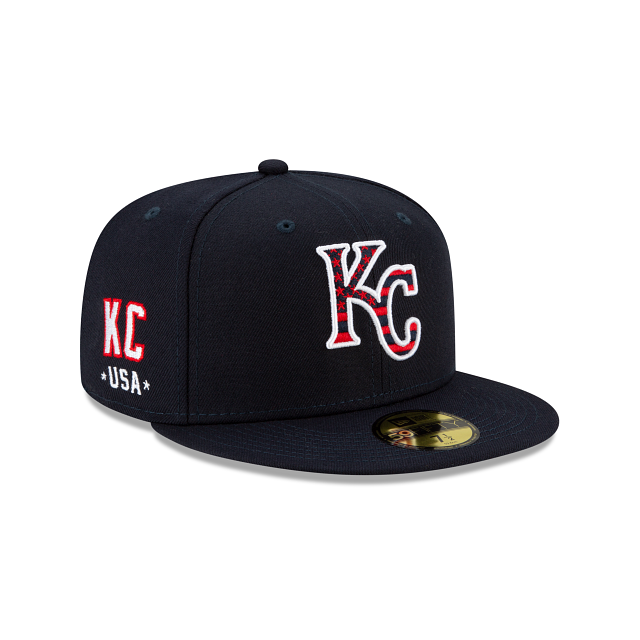 Show your patriotism with the Kansas City Royals Independence Day 59FIFTY Fitted Cap featuring an intricate stars and stripes pattern embroidered within the Royals logo at the front panels with a city-specific logo embroidered at the right wear side and a matching MLB Batterman logo at the rear.