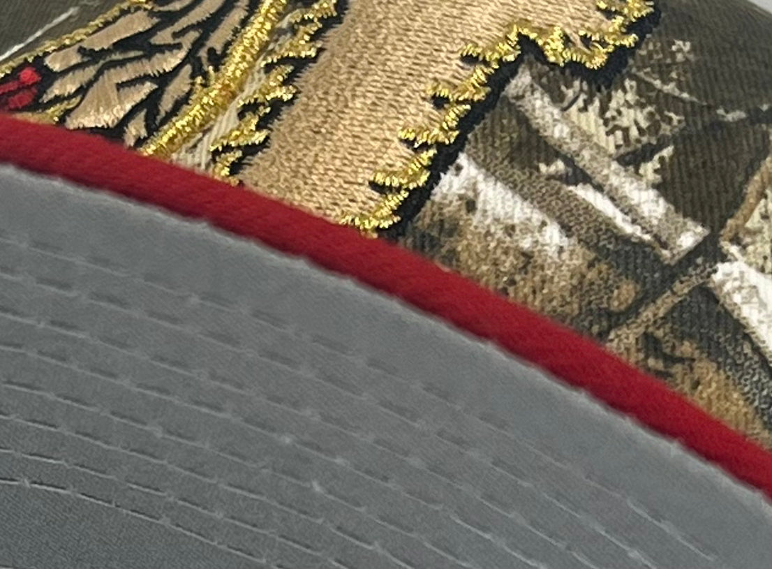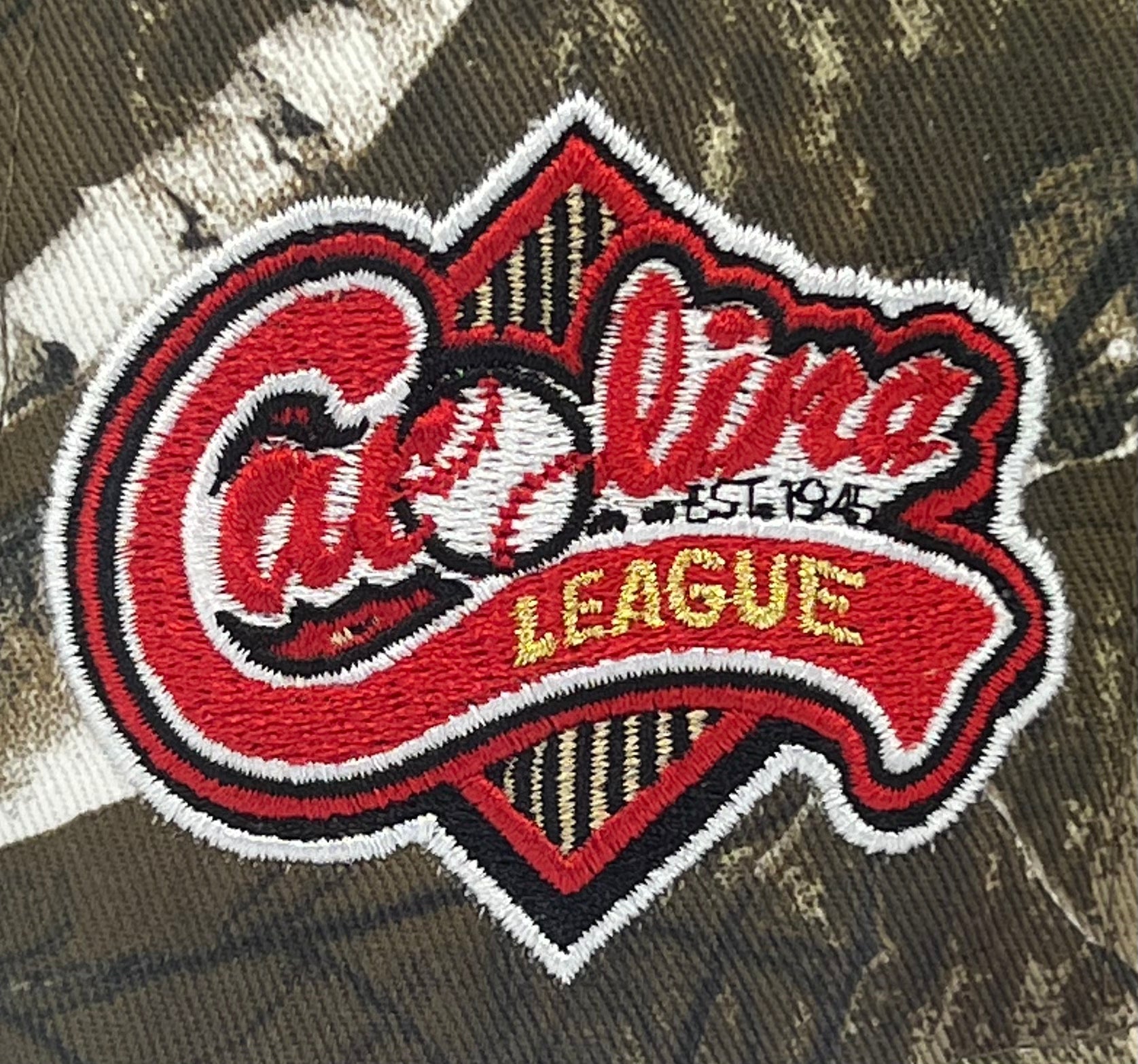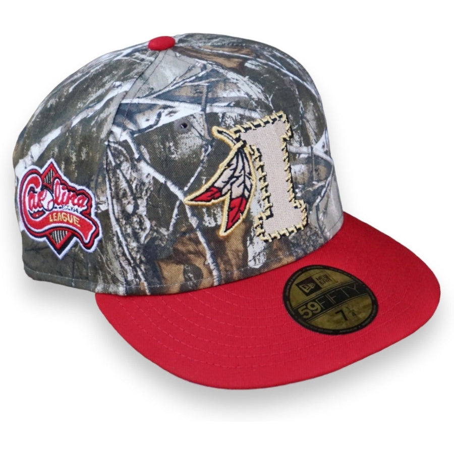 This New Era Kinston Indians 59FIFTY fitted hat features a realtree camo six panel structured high crown and embroidered eyelets with a cardinal red fabric squatchee button and flat visor. The undervisor of the fitted is grey. The front panel includes the Kinston Indians logo embroidery and a Carolina League side patch on the right panel.