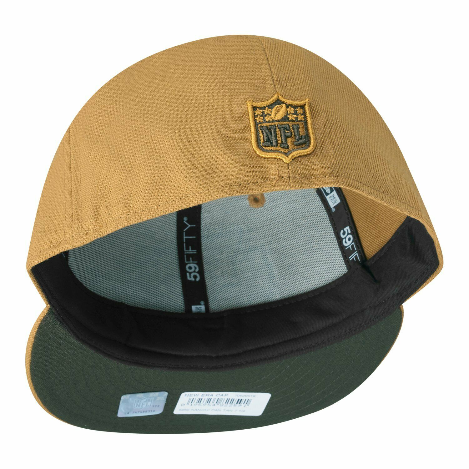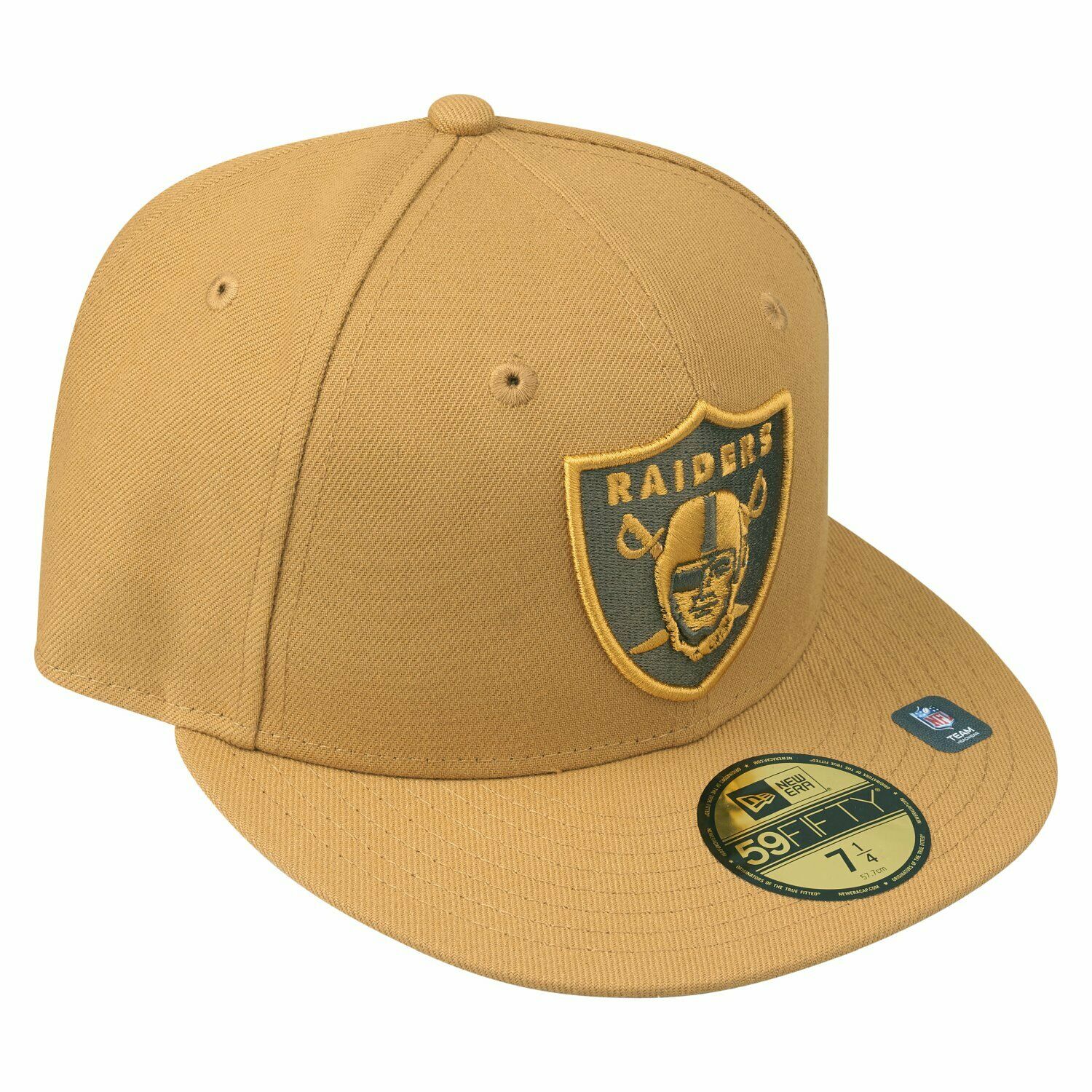 This New Era Las Vegas Raiders fitted hat has a Panama Tan colorway. The six panel structured high crown, embroidered eyelets and fabric squatchee button are Panama Tan. The flat bill of the fitted is also Panama tan with a black sweatband.