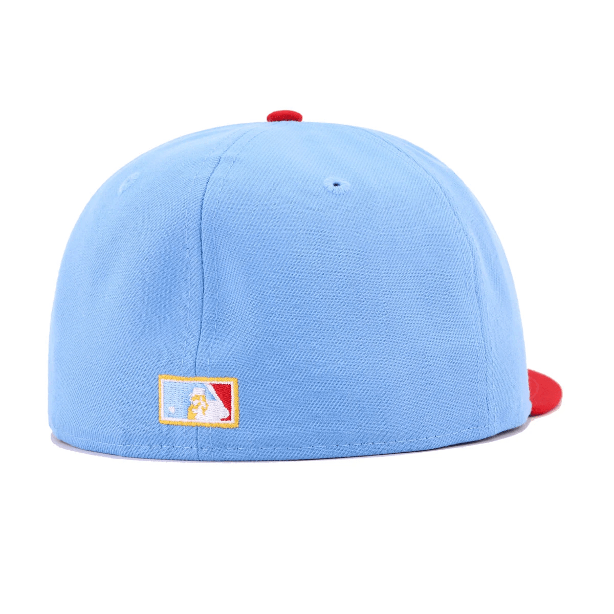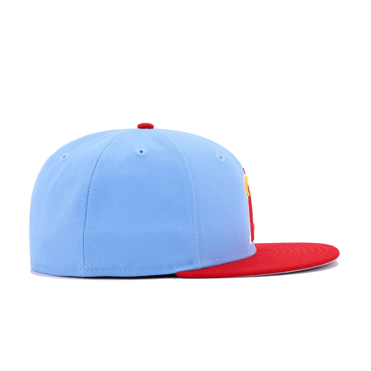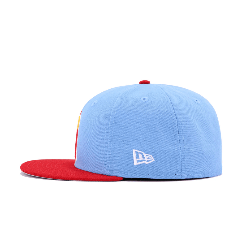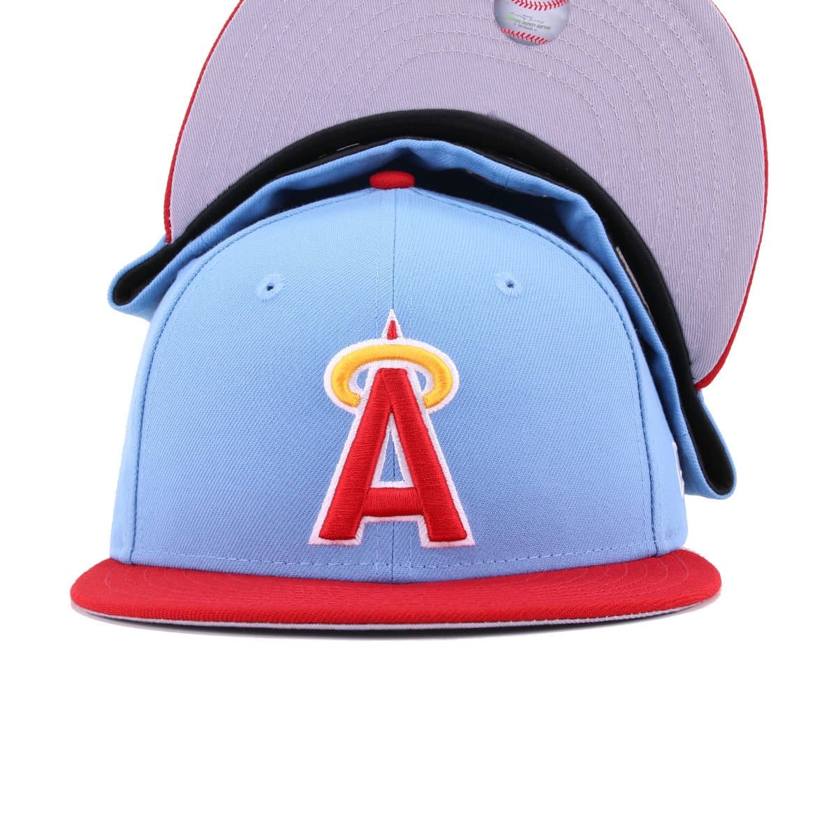 The New Era Los Angeles Angels Cooperstown 59Fifty Fitted Hat sold by Hat Heaven has a sky blue, 6 panel high structure crown an embroidered eyelets. The fabric squatchee button ontop of the LA Angels fitted hat is red as well as the flat brim. The front graphic displays the LA Angels team logo embroidered red and yellow thread outlined in white. The iconic New Era logo is embroidered in white thread and the official MLB batterman logo on the back of the fitted is embroidered in red, yellow and white thread.