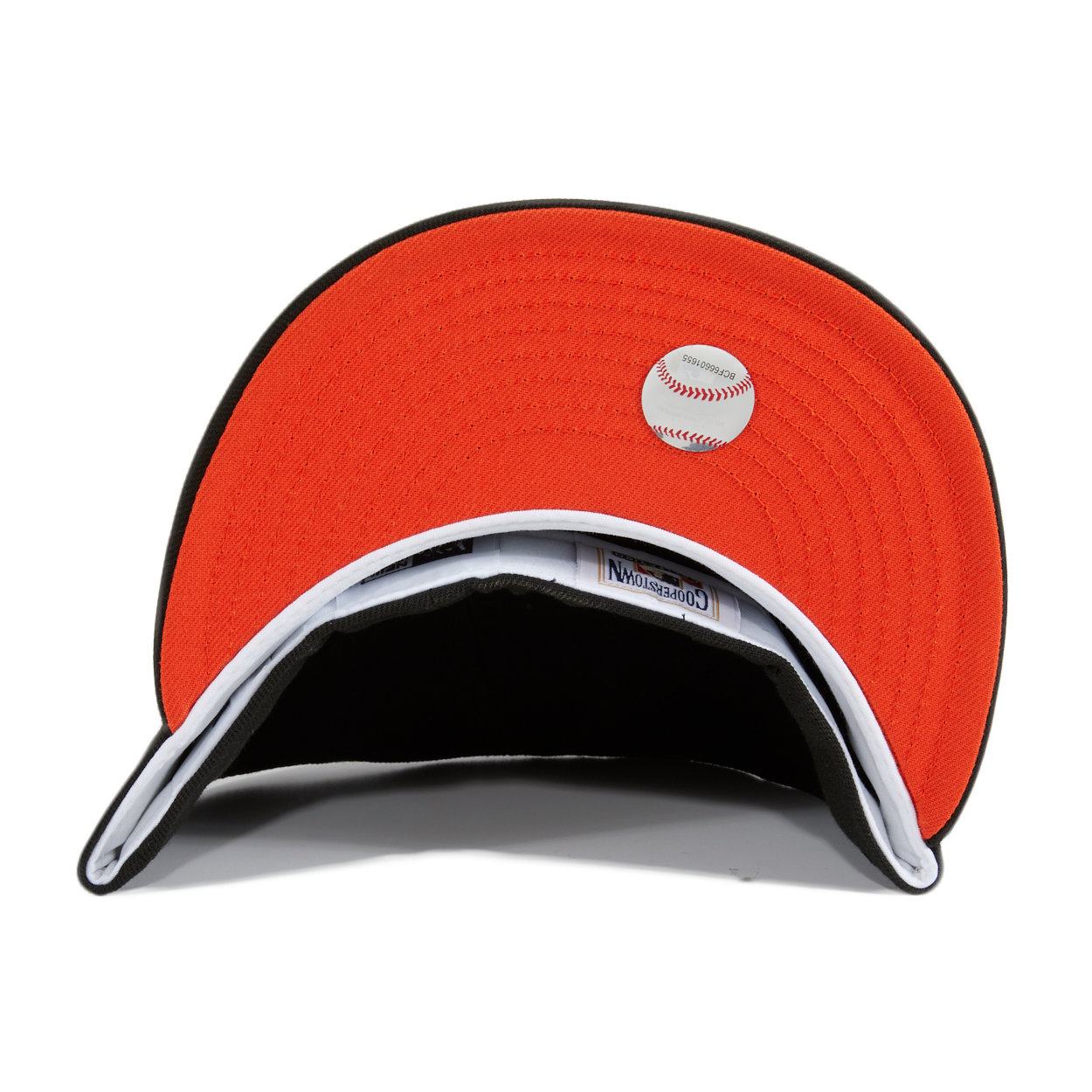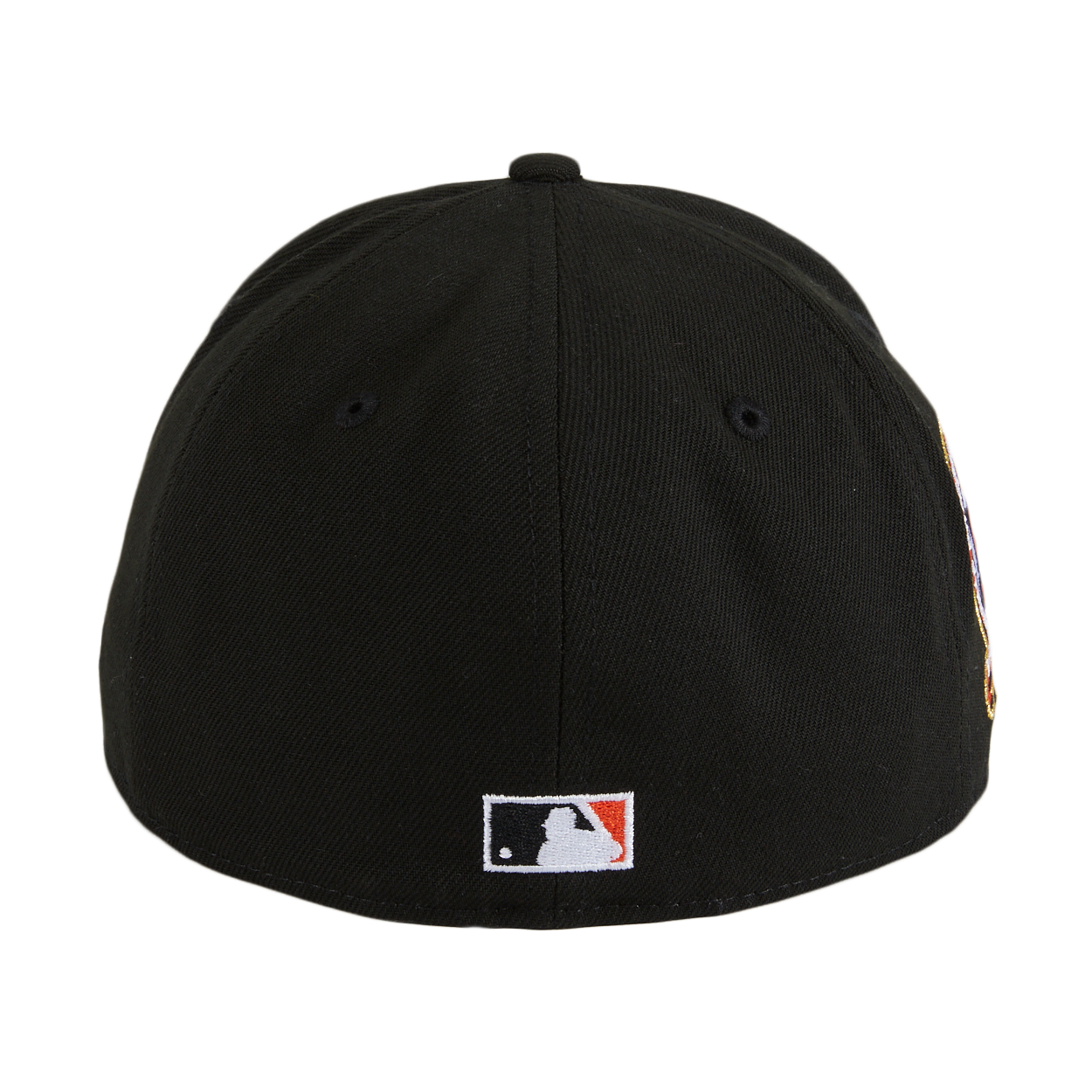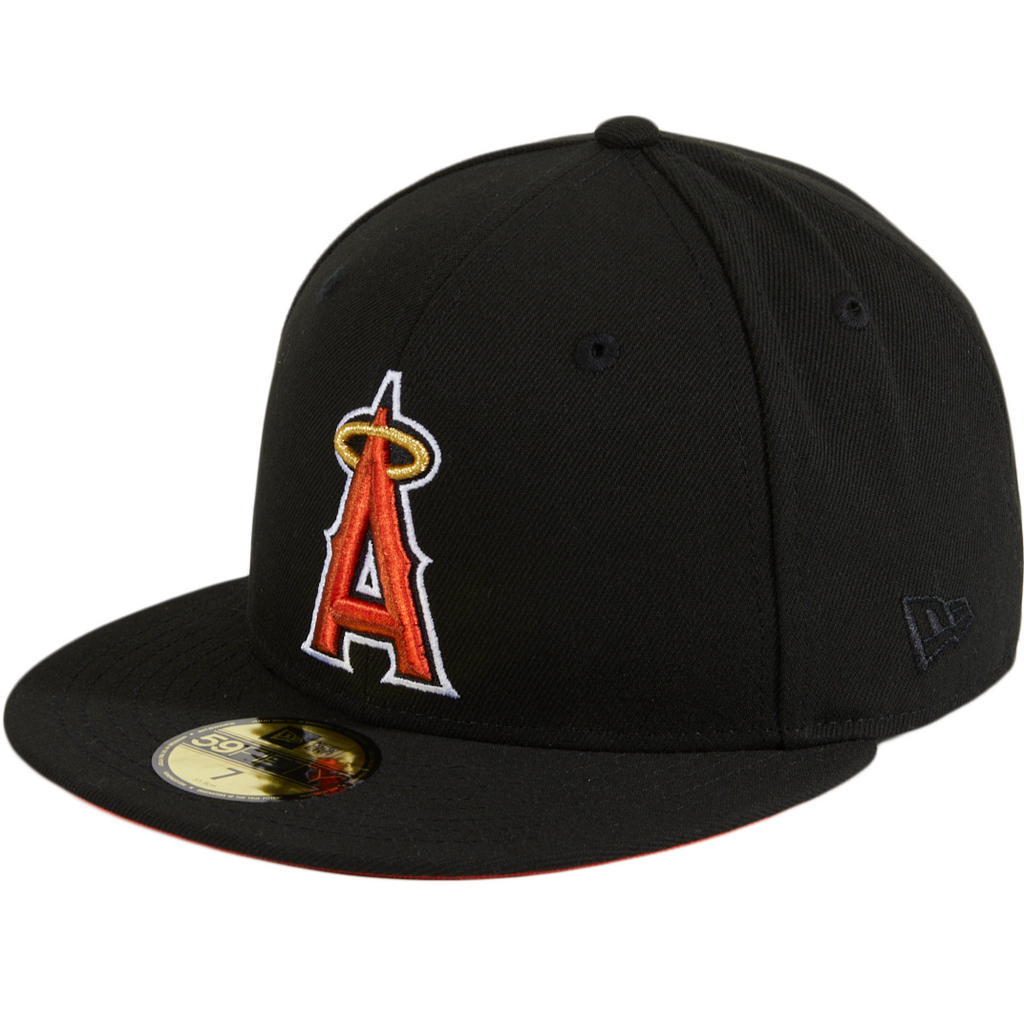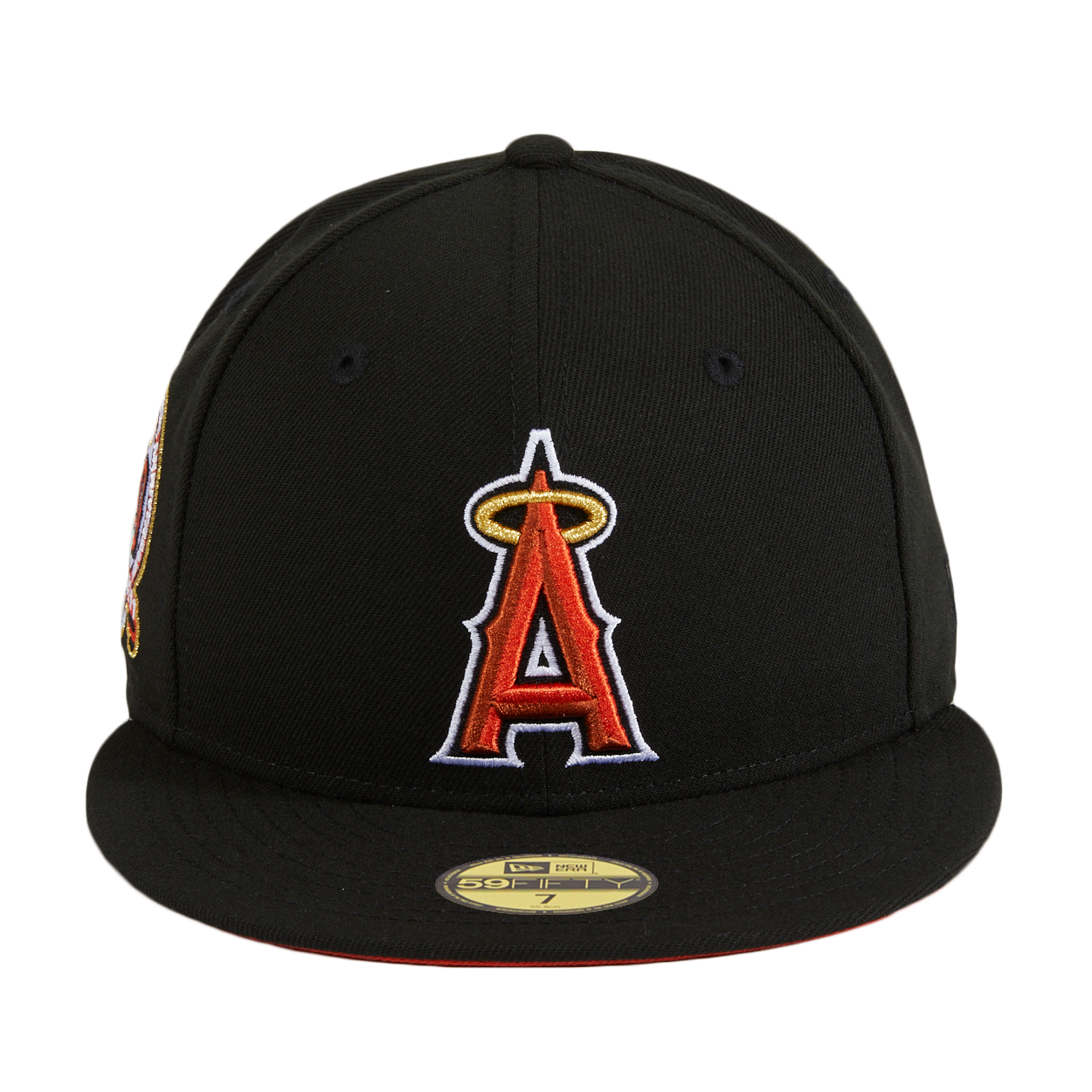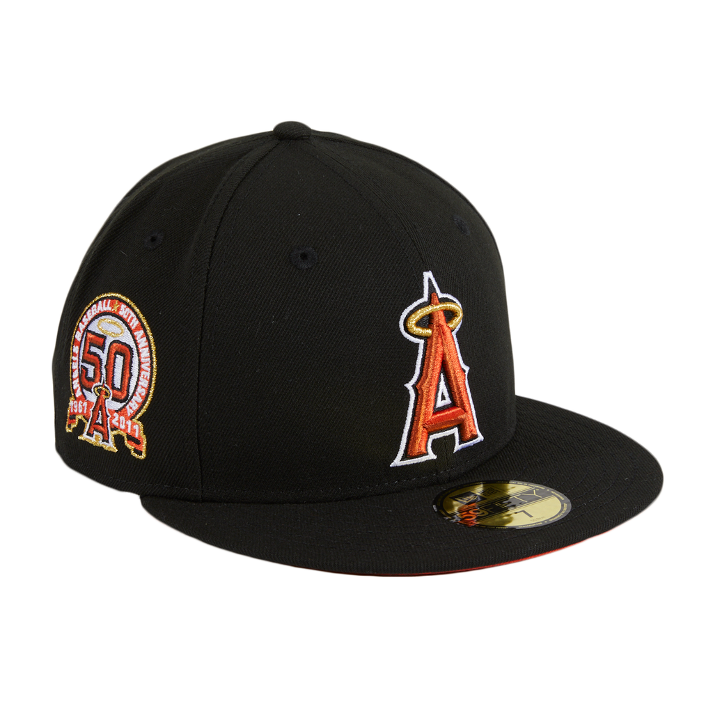 This New Era Los Angeles Angels 59FIFTY fitted hat is a Hat Club exclusive part of their Breakaway collection. The fitted has a black high crown, embroidered eyelets, fabric squatchee button and flat bill with an orange undervisor and white sweatband. The front panel features the Angels logo embroidery and a 50th Anniversary side patch on the right panel.