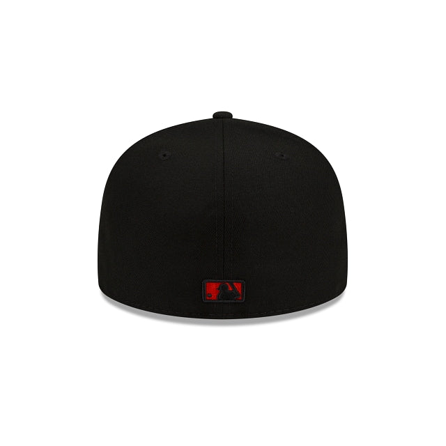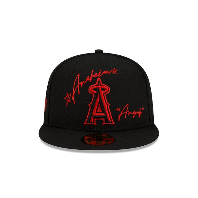 The Los Angeles Angels Cursive 59FIFTY Fitted Cap features an embroidered Angels logo with a matching cursive script at the front panels, a World Series patch embroidered at the right-wear side and the MLB Batterman logo at the rear. Additional details include a gray undervisor.