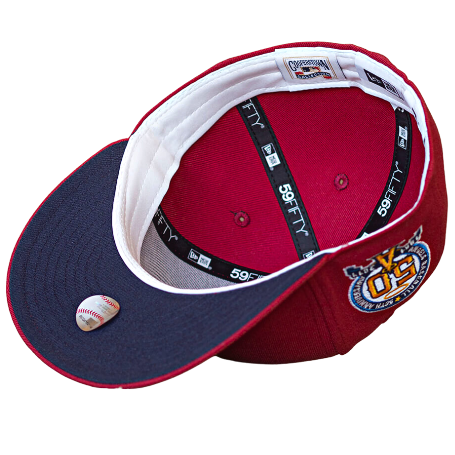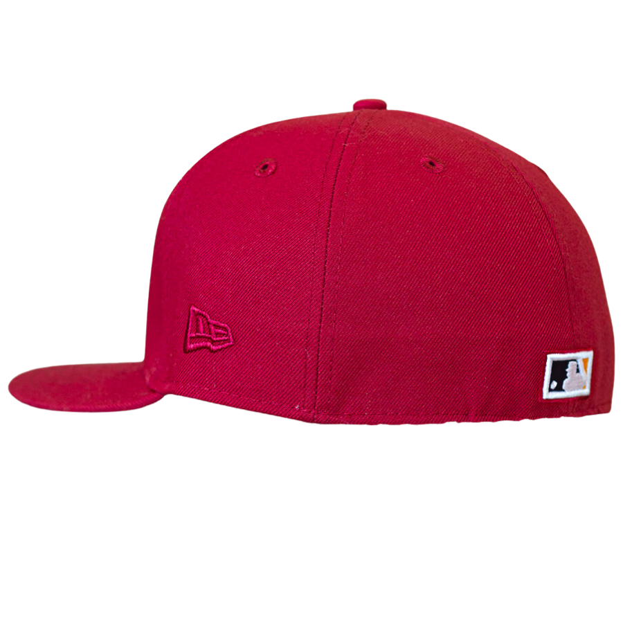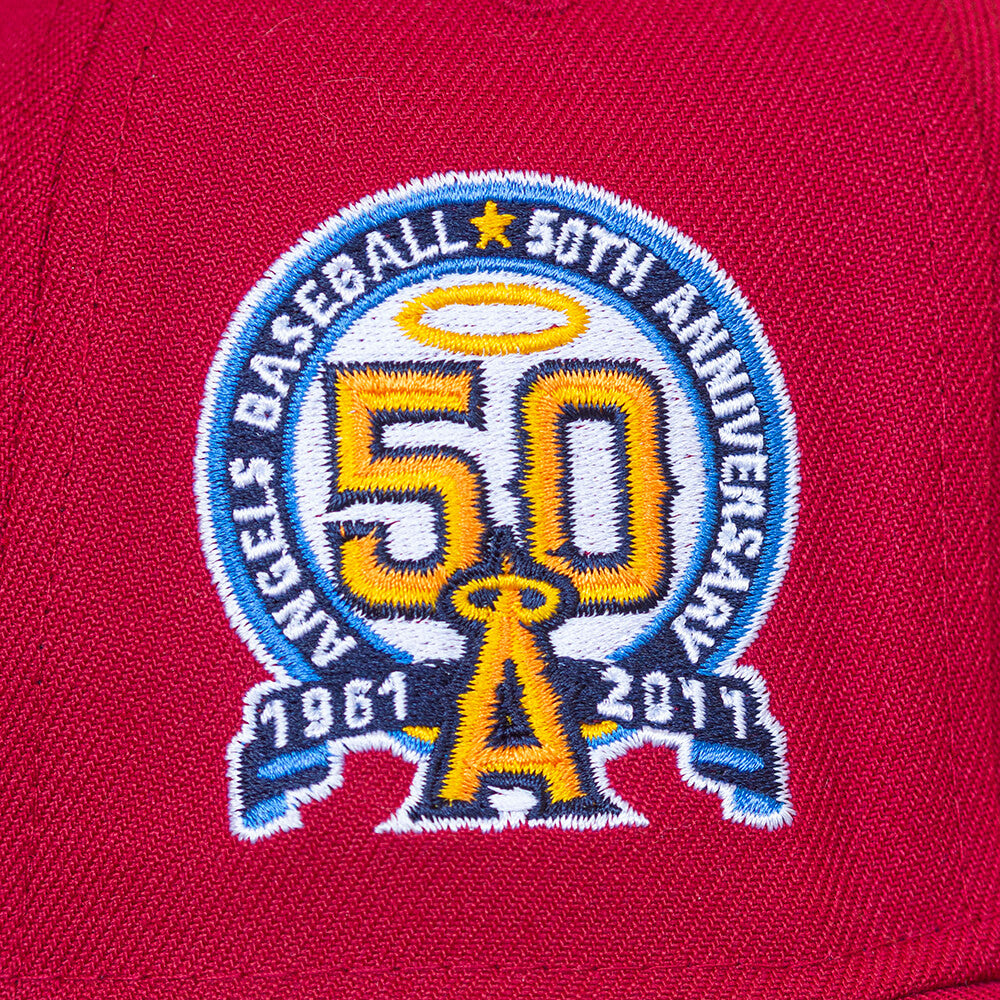 This New Era Los Angeles Angels fitted hat has a pinot red six panel structured high crown, embroidered eyelets and fabric squatchee button. The flat bill of the fitted cap is also pinot red with a navy blue bottom undervisor and white sweatband. The front panel features the LA Angels logo embroidery. The right panel features a 50th Anniversary side patch embroidery.