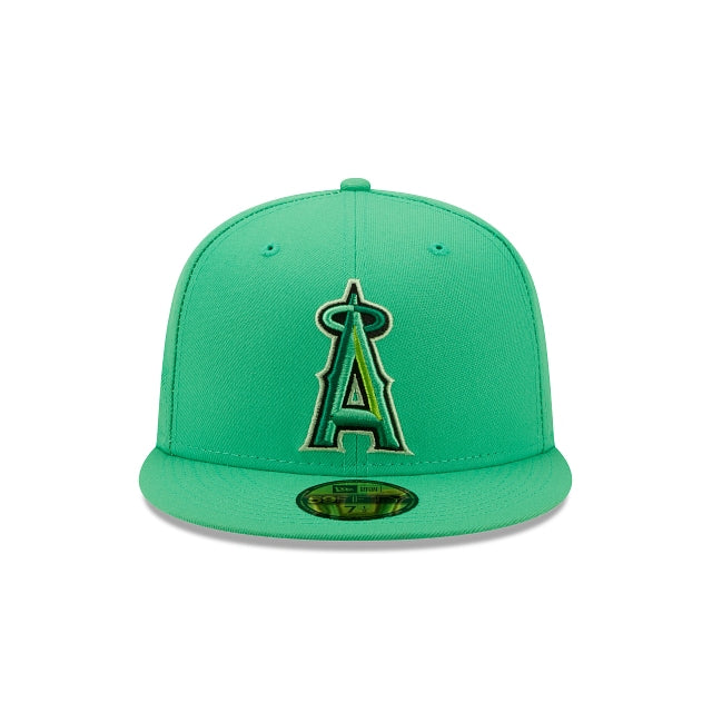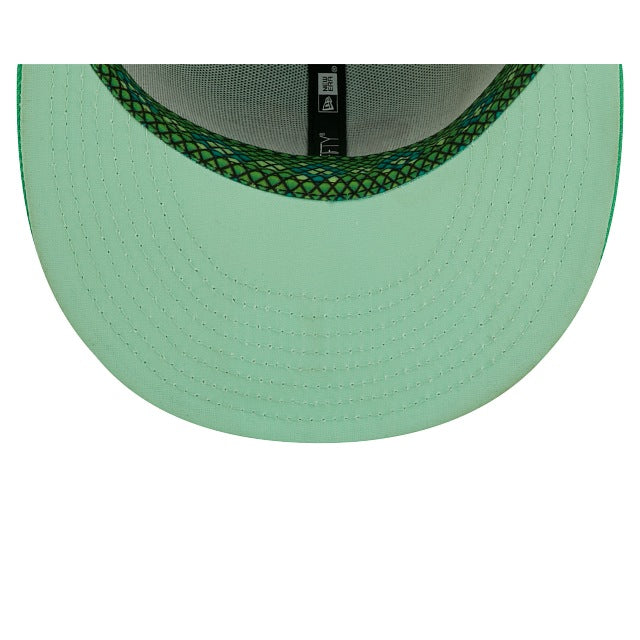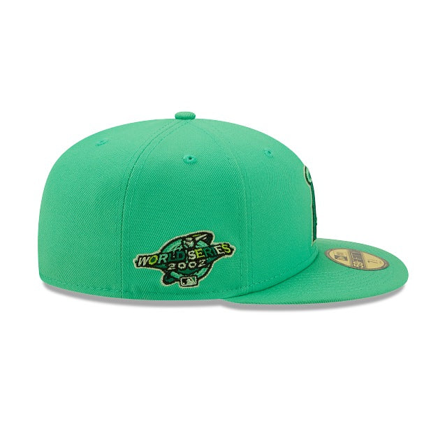 The Los Angeles Angels Snakeskin 59FIFTY Fitted Cap features an embroidered Angels multi-colored logo at the front panels, a 2002 World Series patch at the right-wear side, and a matching MLB Batterman logo at the rear. Additional details include a snakeskin inspired inner sweatband and green undervisor.