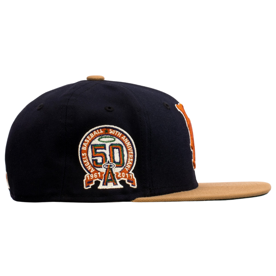 This New Era Los Angeles Angels 'Varsity Blues' 2023 59FIFTY Fitted Hat was released by Shoe Palace. The fitted has a navy blue six panel structured high crown and embroidered eyelets with a khaki fabric squatchee button. The flat bill of the fitted cap is also khaki with a pine green undervisor and black sweatband. The front panel features the Los Angeles Angels logo embroidery and a side patch on the right panel. The left panel of the fitted displays the New Era logo and the MLB insignia embroidered on the rear crown.