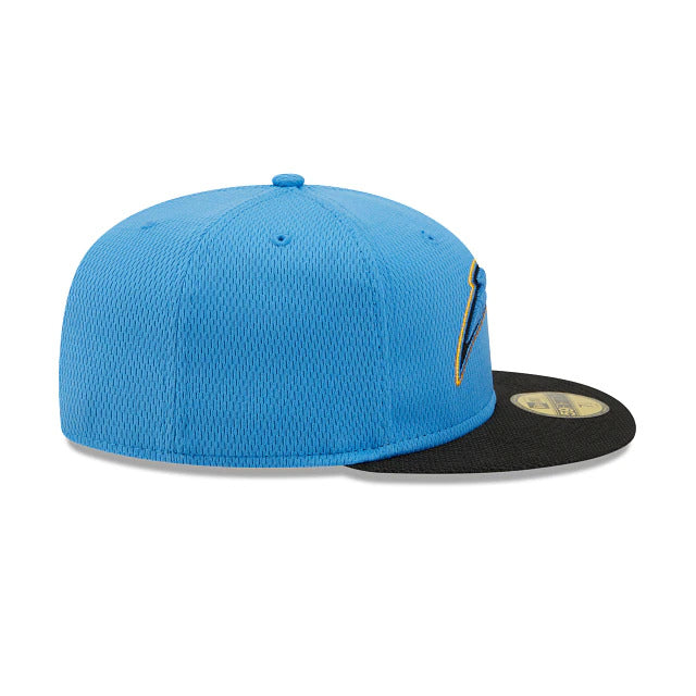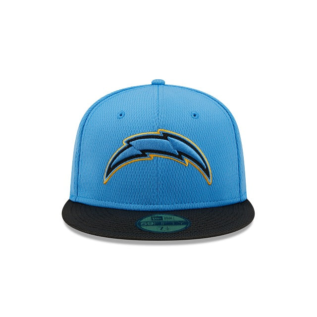 Travel in style with the Los Angeles Chargers Official NFL Sideline Road 59FIFTY Fitted Cap featuring a unique two-tone dashmark fabrication with an embroidered team logo at the front panels. Team color accents and the Official NFL Shield at the rear complete the official cap that players, coaches and staff will wear on the sidelines during the 2021 NFL season.