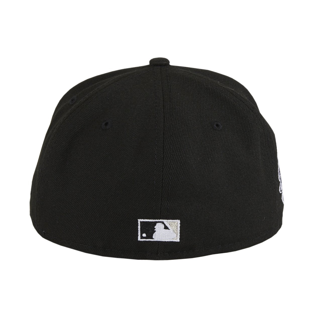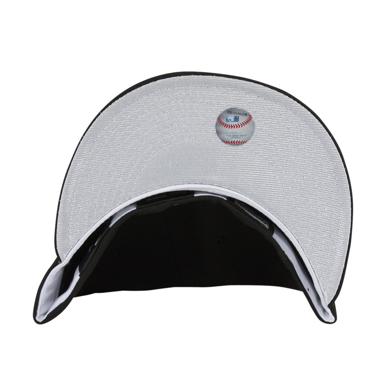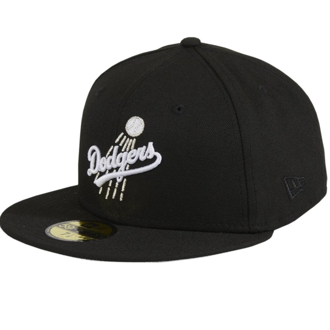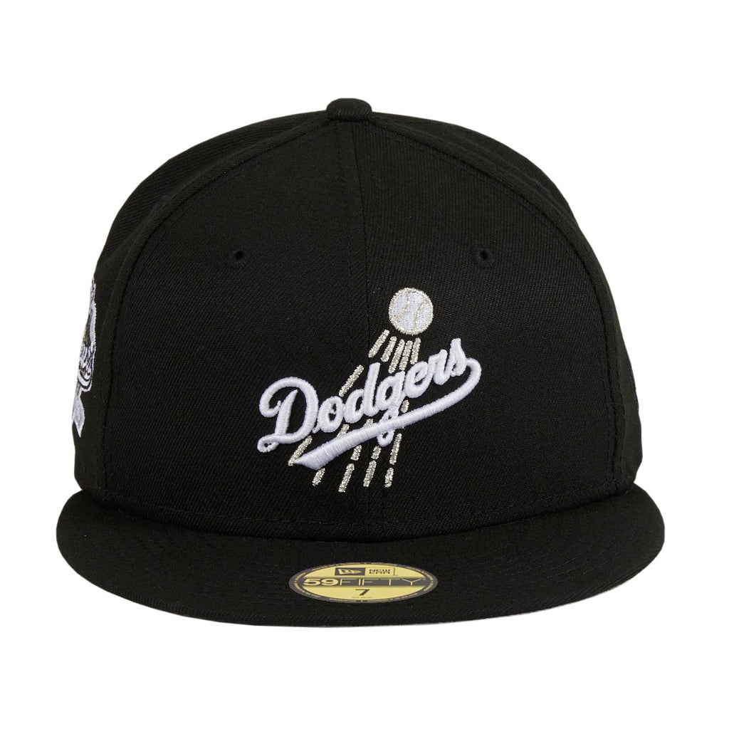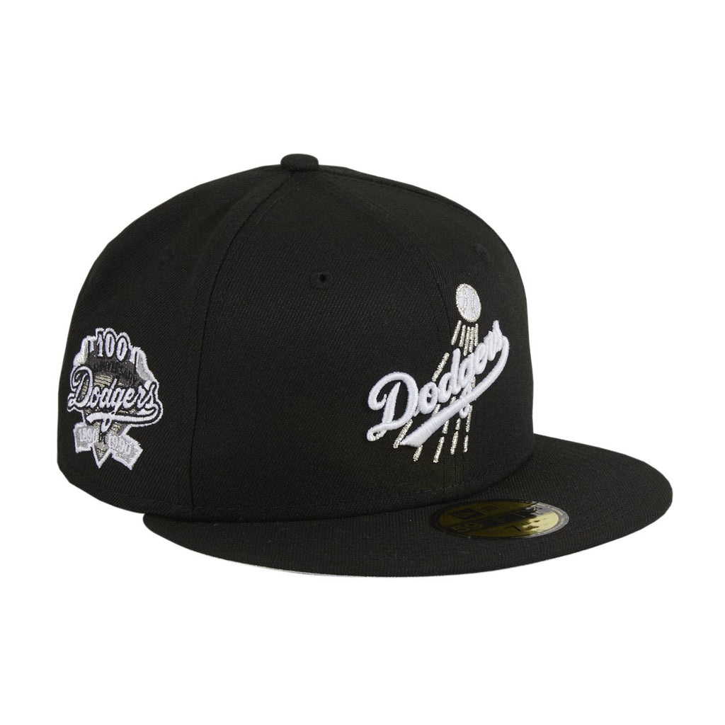 This New Era Los Angeles Dodgers 100th Anniversary 59FIFTY fitted hat is a Hat Club exclusive from their Ice Cold Fashion collection. The fitted hats a black six panel structured high crown, embroidered eyelets and flat bill with a grey bottom undervisor. The front panel features a throwback Dodgers logo. The right panel features the 100th Anniversary side patch.