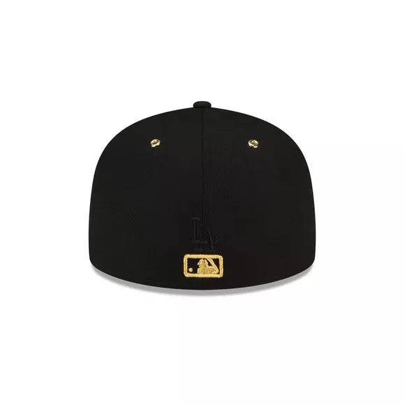 This New Era Los Angeles Dodgers 59FIFTY fitted hat is a Hibbett exclusive. The fitted has a black six panel construction, a black fabric squatchee button ontop of the crown and metal eyelets. The flat bill of the fitted cap is also blasck with a gold undervisor and sweatband. The front panel includes the LA Dodgers logo embroidered in black with dripping gold. The right panel also includes a side patch embroidery in the same black and gold colorway.