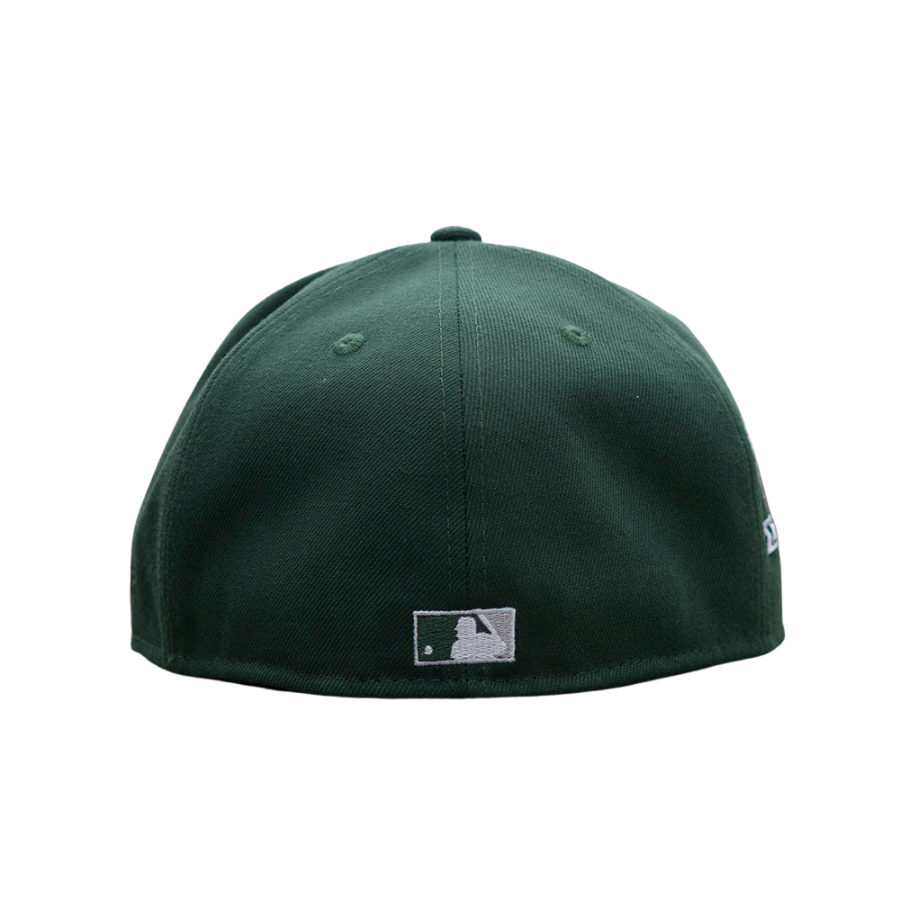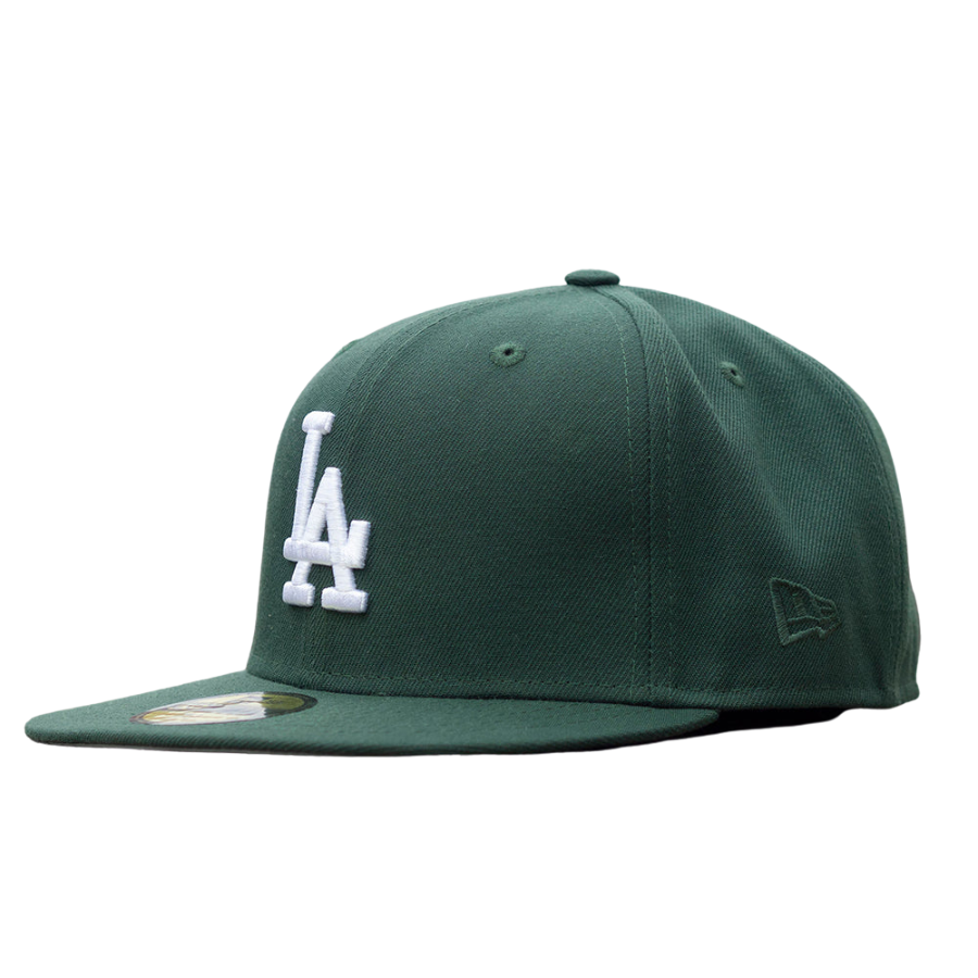 This New Era Los Angeles Dodgers 50th Anniversary Pine Green 59FIFTY fitted cap has a pine green six panel structured high crown, embroidered eyelets and fabric squatchee button. The flat bill of the fitted is also pine green with a light gray undervisor. The front panel features the Los Angeles Dodgers logo embroidery and a 50th Anniversary side patch embroidered on the right-wear side.