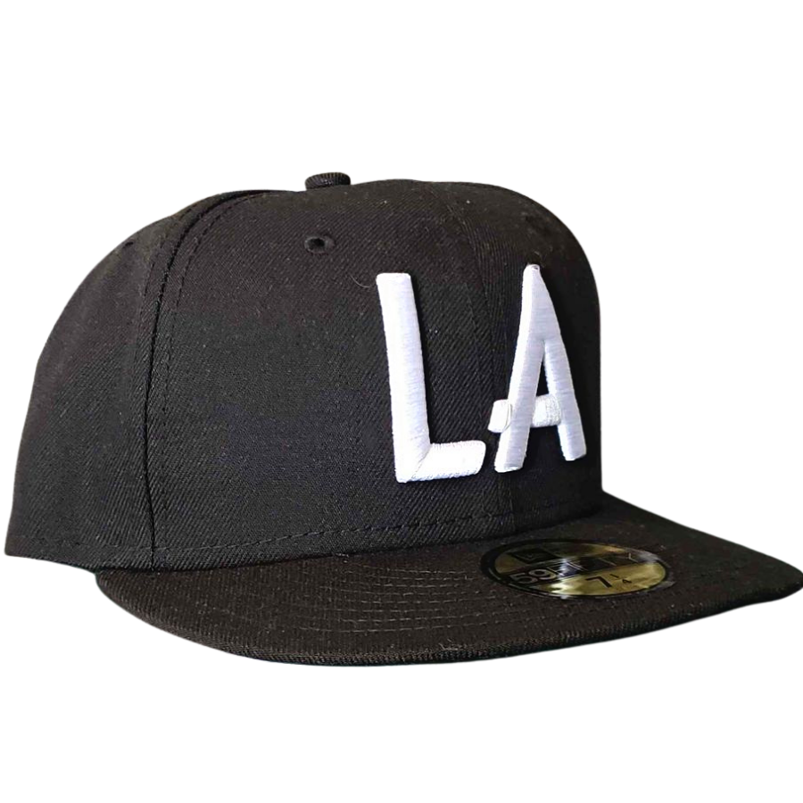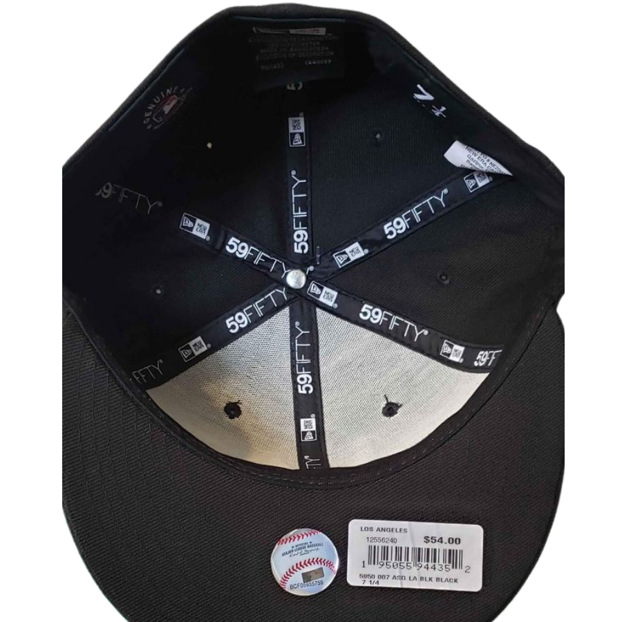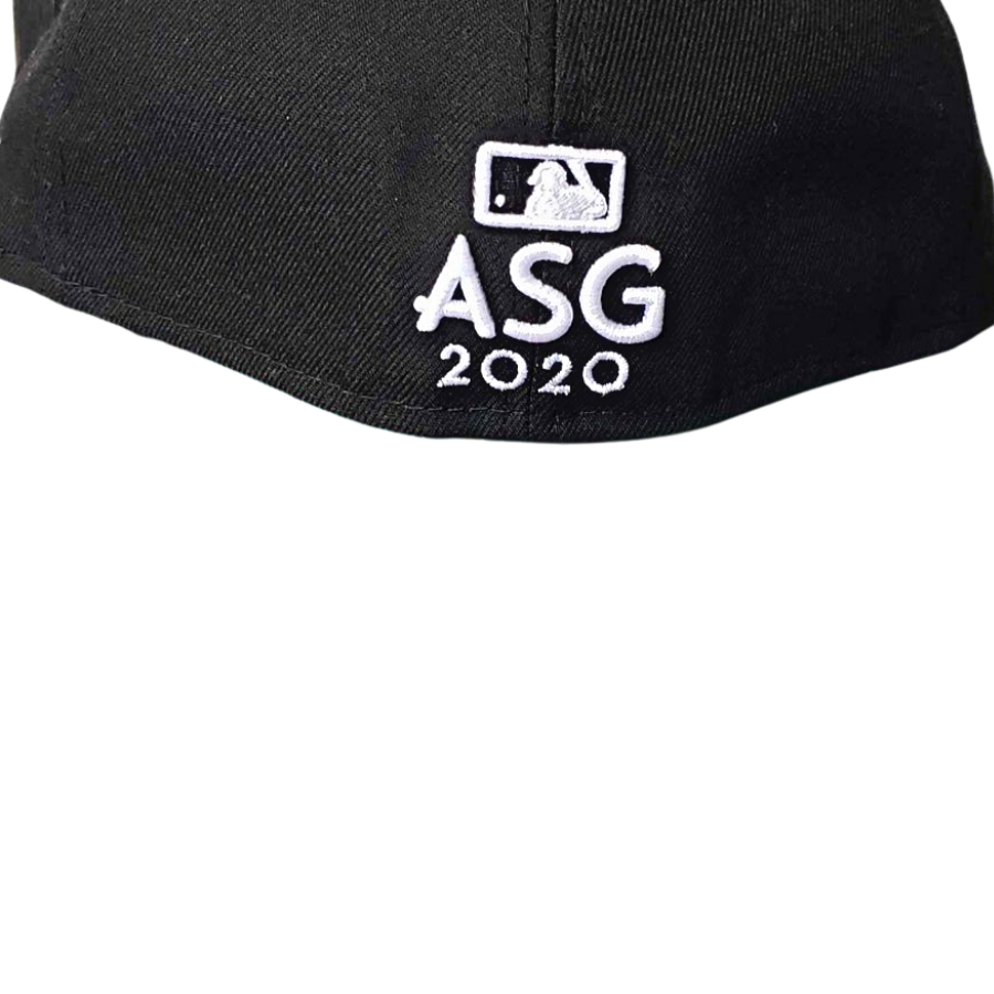 This New Era Los Angeles Dodgers fitted hat has a black and white colorway. The 59FIFTY fitted features a black six panel structured high crown, embroidered eyelets and fabric squatchee button. The flat bill of the fitted is black with a "Black Nasty" black undervisor. The front panel features the lettermarks "LA" and "ASG 2020" embroidered in white thread on the back of the crown.