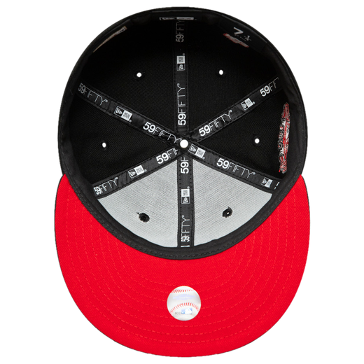 This Los Angeles Dodgers 59FIFTY fitted hat features an all black six panel construction including eyelets and fabric squatchee button located at the top of the crown. The flat brim of the fitted is also black with a red undervisor. The front panel includes the LA Dodgers logo embroidered in all black stitching with a red kiss lips embroidered slightly off to the left. The right wear side of the fitted includes a side patch embroidery and a red kiss lip on the back of the rear crown.