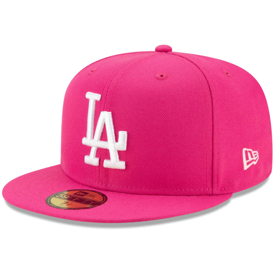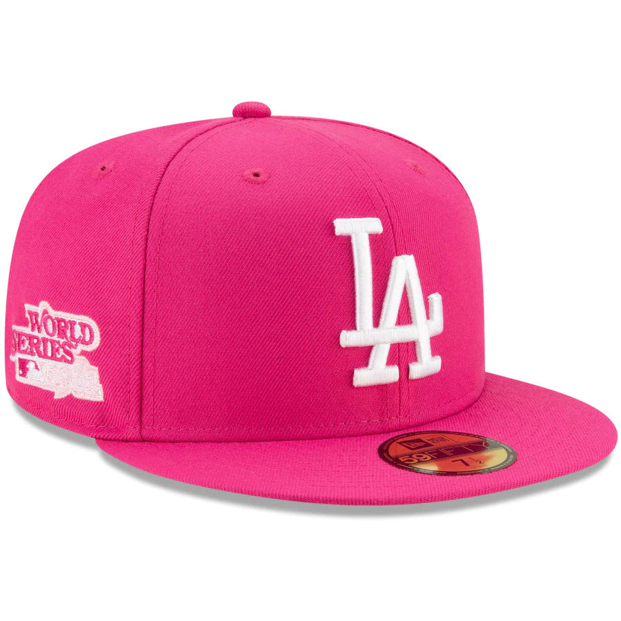 The New Era Pink LA Dodgers fitted hat features a hot pink colorway. The structured six panel high crown, embroidered eyelets and fabric squatchee button are hot pink. The flat bill of the fitted is also hot pink with a soft pink bottom undervisor. The front panel features the LA Dodgers "LA" logo front and centered embroidered in white thread. The New Era logo located on the left panel of the fitted is also embroidered in white thread as well as the 1981 World Series side patch on the right panel. This pink la fitted hat is officially licensed.