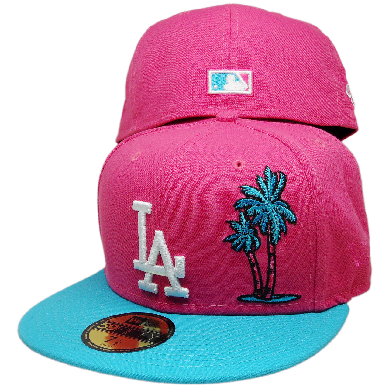This New Era Los Angeles Dodgers 59FIFTY fitted hat has a hot pink six panel structured high crown, embroidered eyelets and fabric squatchee button. The flat bill of the fitted cap is teal with a soft pink undervisor and a black sweatband. The front panel features the LA Dodgers logo embroidery with an teal palm tree embroidery and a 1988 World Series side patch on the right panel.