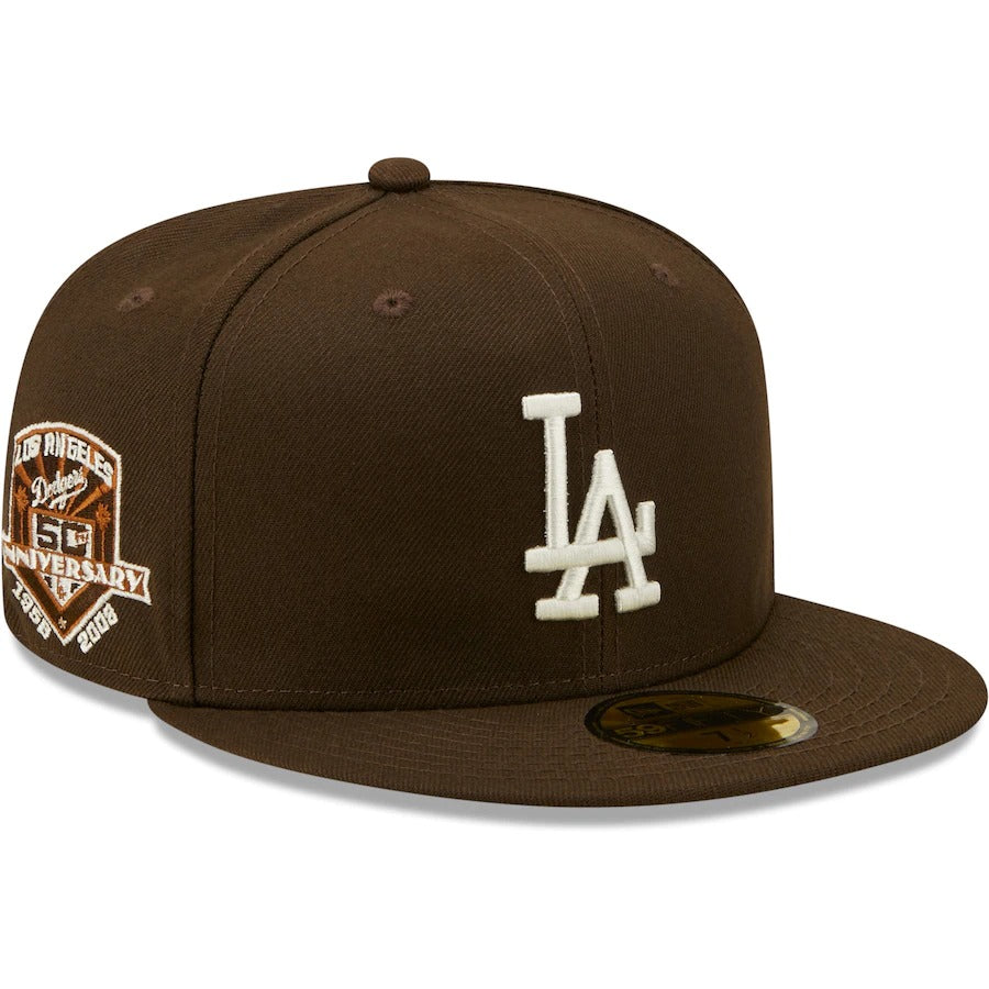 Celebrate the accomplishments of your Los Angeles Dodgers with this 50th Anniversary 59FIFTY hat from New Era. It features the Los Angeles Dodgers logo in raised embroidery, commemorative details on the side and a cream undervisor. The neutral color palette makes this fitted cap a dashing finish to any outfit.