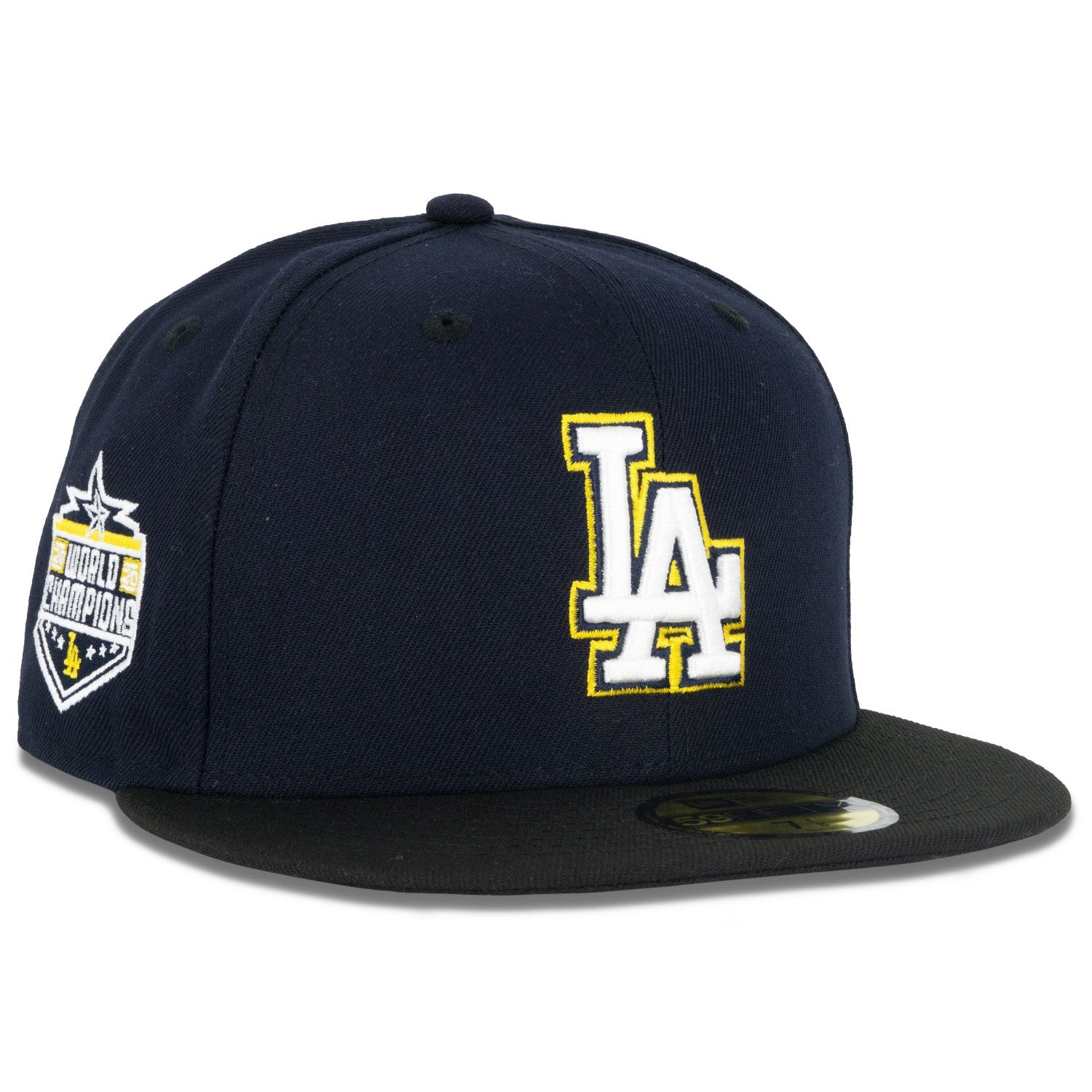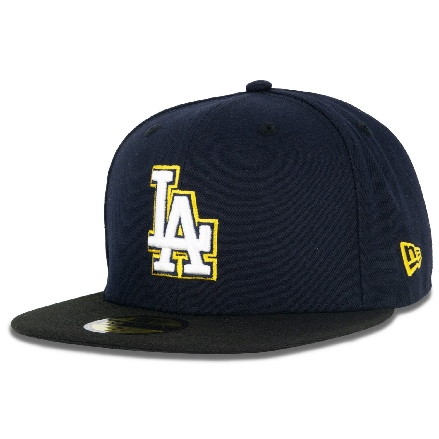 This New Era Los Angeles Dodgers Lightning 59FIFTY Fitted Hat was released by Just Sports. The fitted cap has a navy blue six panel structured high crown, embroidered eyelets and fabric squatchee button. The fitted cap also has a black flat bill. The front panel includes the Los Angeles Dodgers logo embroidered in white. yellow and navy blue stitching with a side patch on the right-wear side. The left panel of the fitted displays the New Era logo and the official NFL logo embroidery on the rear crown.