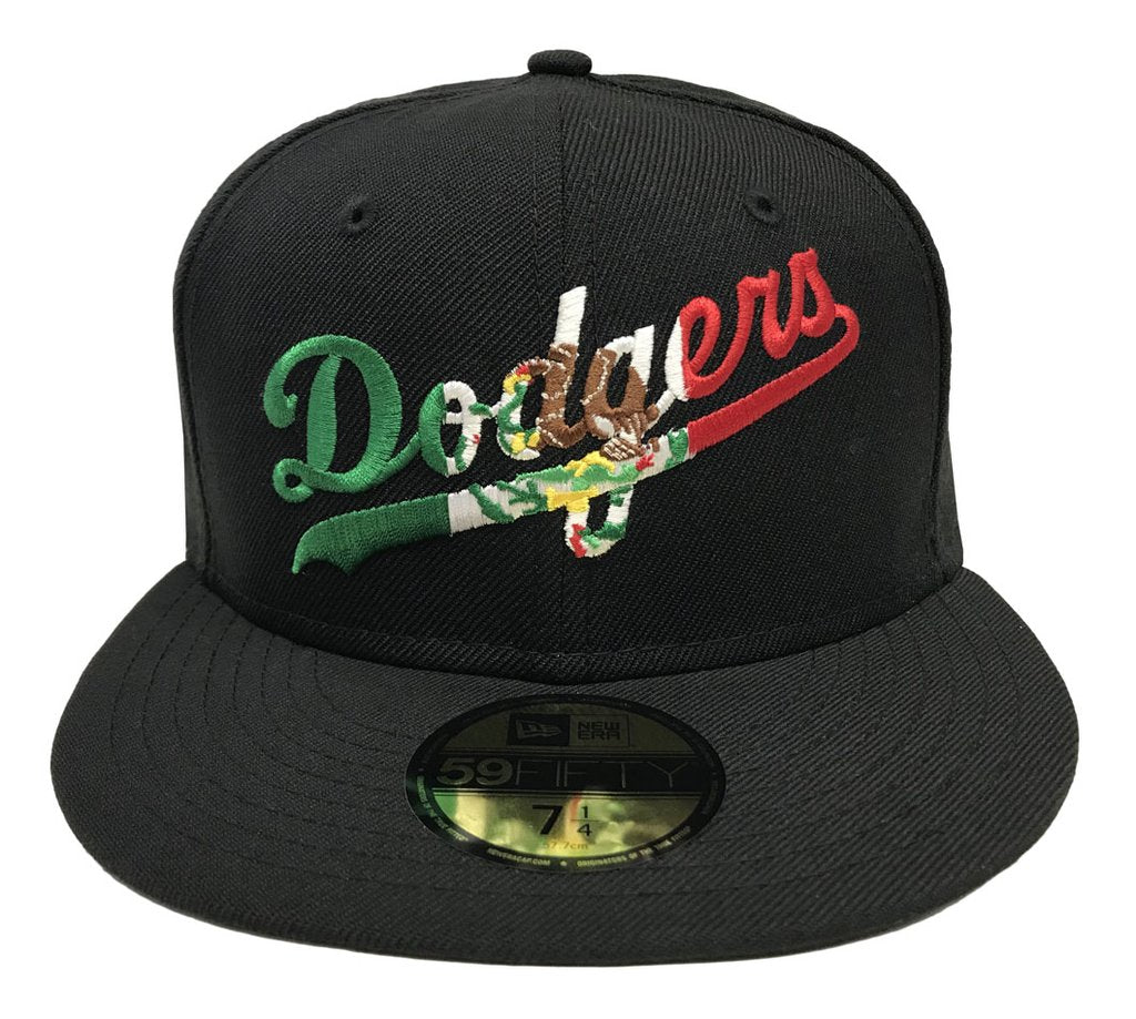 The New Era Los Angeles Dodgers Mexico Fitted Hat has a black and Mexico green, white and red colorway. The structured six panel high crown, embroidered eyelets and fabric squatchee button are black in color. The flat bill of the fitted is also black. The front panel of the fitted cap features the "Dodgers" wordmark in Mexico flag pattern.