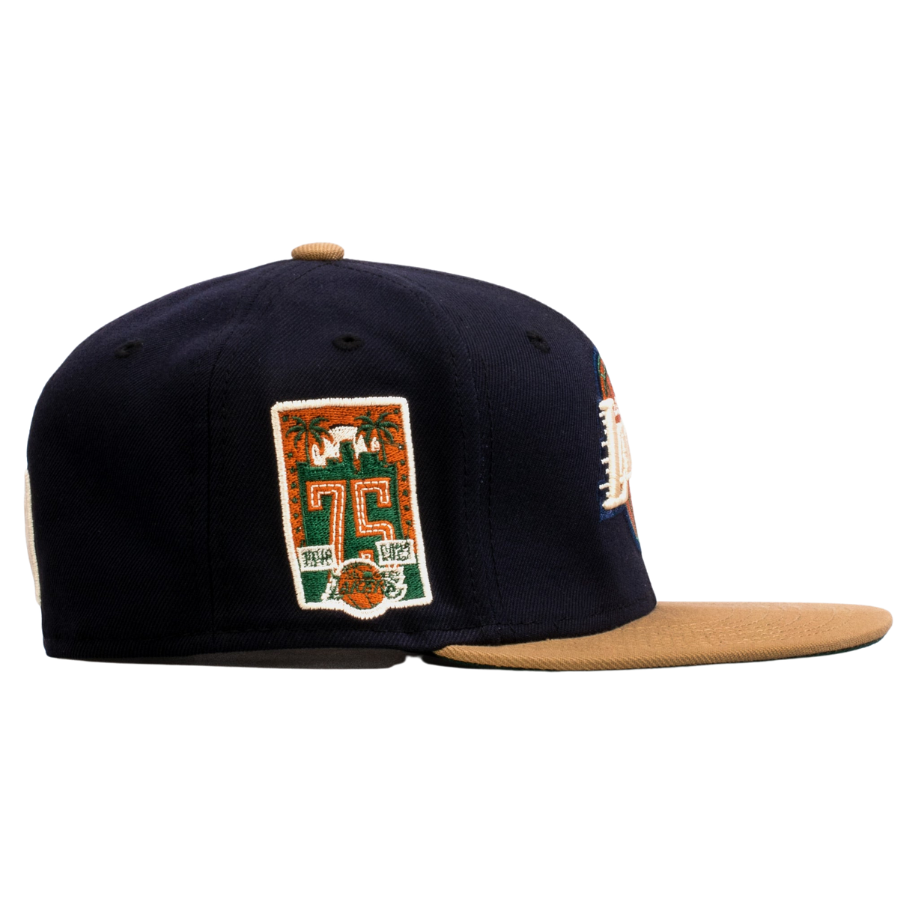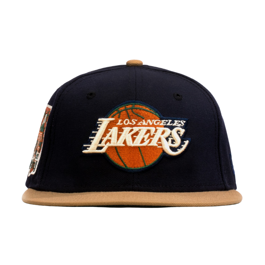 This New Era Los Angeles Lakers 'Varsity Blues' 2023 59FIFTY Fitted Hat was released by Shoe Palace. The fitted has a navy blue six panel structured high crown and embroidered eyelets with a khaki fabric squatchee button. The flat bill of the fitted cap is also khaki with a pine green undervisor and black sweatband. The front panel features the Los Angeles Lakers logo embroidery and a side patch on the right panel. The left panel of the fitted displays the New Era logo and the NBA