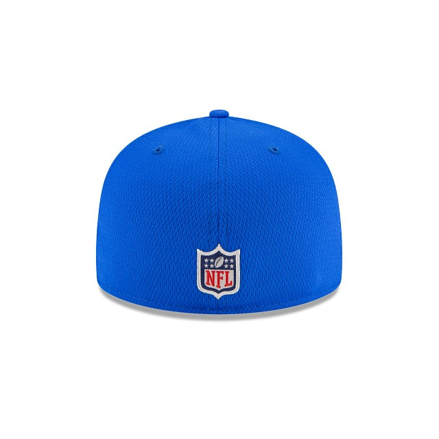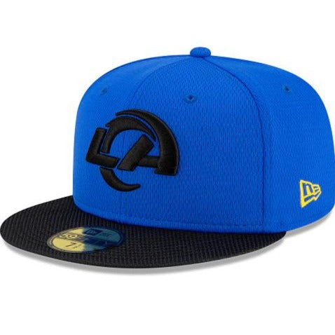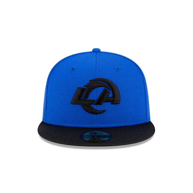 Travel in style with the Los Angeles Rams Official NFL Sideline Road 59FIFTY Fitted Cap featuring a unique two-tone dashmark fabrication with an embroidered team logo at the front panels. Team color accents and the Official NFL Shield at the rear complete the official cap that players, coaches and staff will wear on the sidelines during the 2021 NFL season.