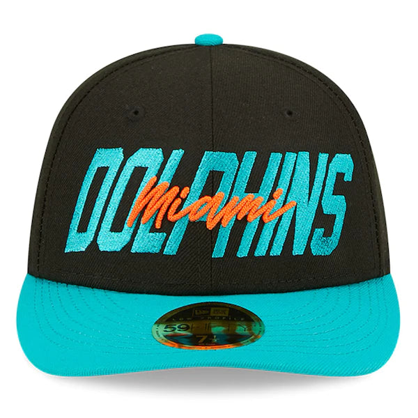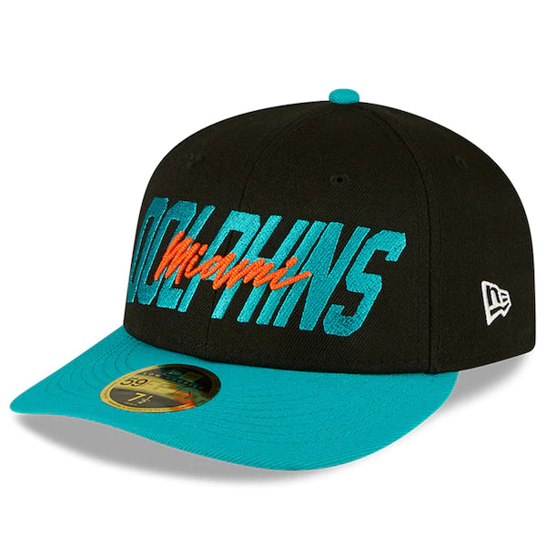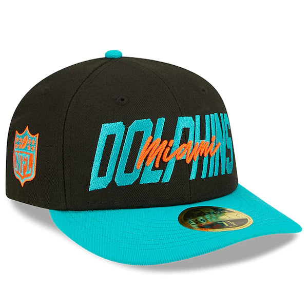 With your next pick, you should select this Miami Dolphins Low Profile 59FIFTY Fitted Hat from the official 2022 NFL Draft collection. This New Era cap features an NFL shield on the side and an official team color visor. Also sporting an embroidered version of your favorite team's logo on the rear of the cap, this gear has it all and will get you pumped for the upcoming Miami Dolphins season.