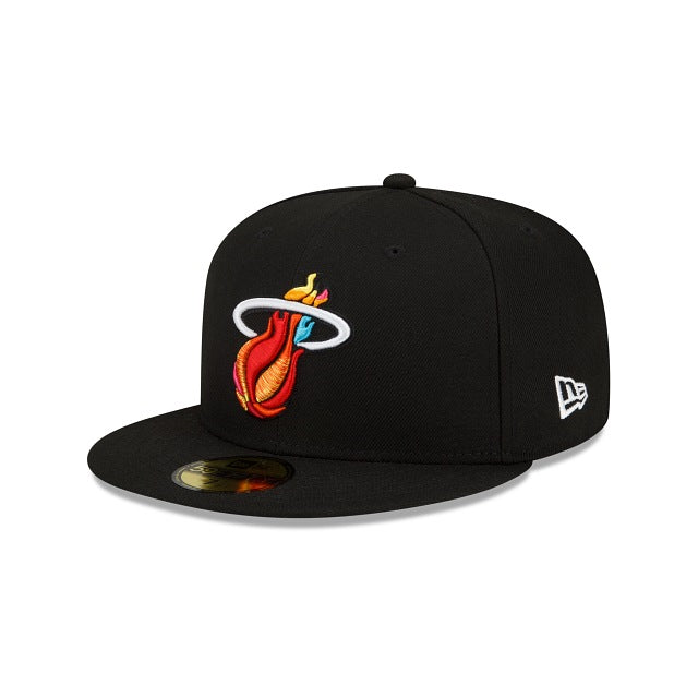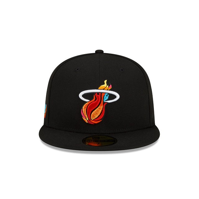There's no limit in this city. The Miami Heat City Edition Alt 59FIFTY Fitted Cap features a uniquely curated, historically inspired embroidered Heat logo at the front panels, a team inspired embroidery at the right-wear side, and the Official NBA 75th Anniversary logo at the rear.