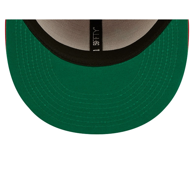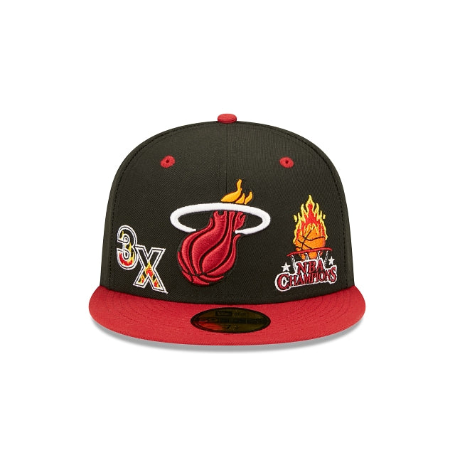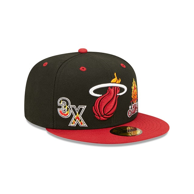 The Miami Heat Fire 59FIFTY Fitted Cap features an embroidered Heat logo at the front panels between NBA Championship themed patches, and an NBA logo at the rear. Additional details include a green undervisor.