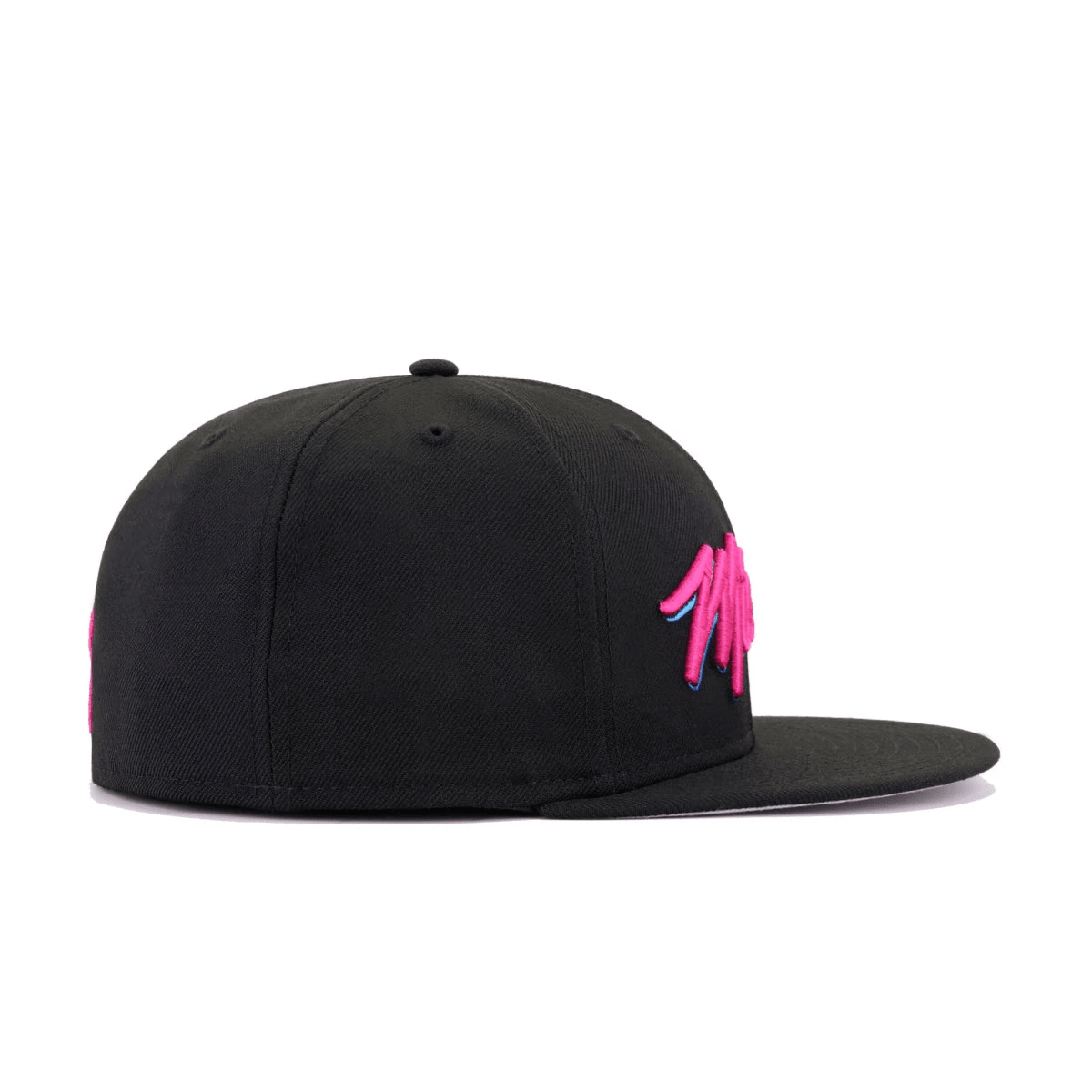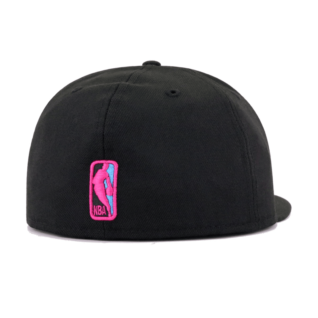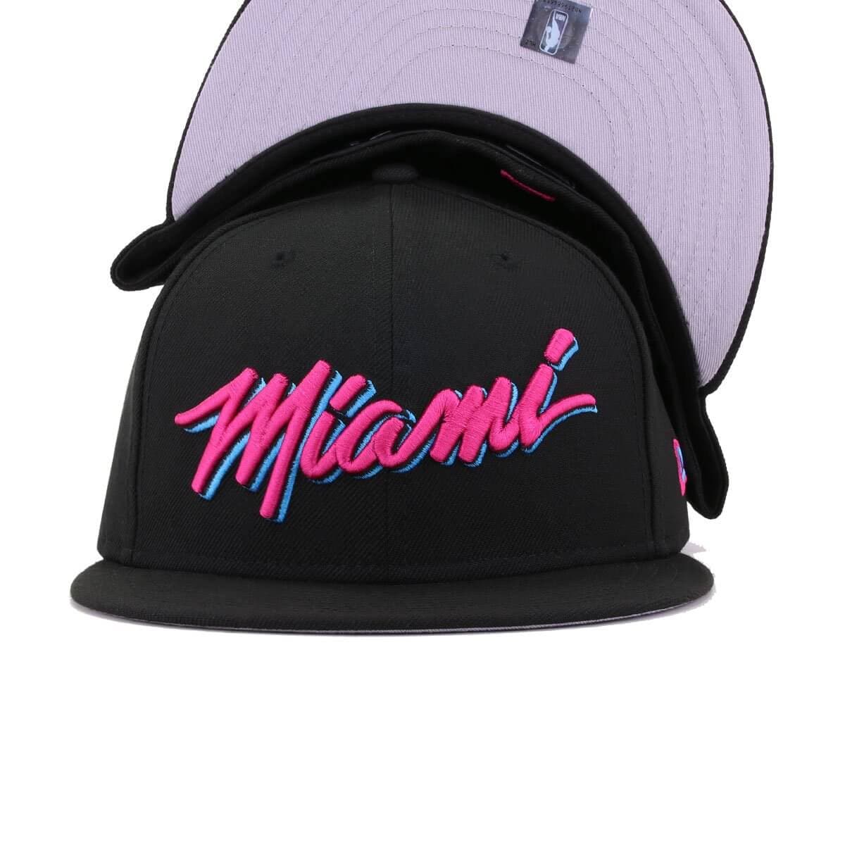 Miami Heat Purple City 59Fifty Fitted Hat sold by Hat Heaven is a perfect fitted not only for men but also women. Because of the black, pink & baby blue colorway its a unisex fitted hat. The 6 panel high structure crown of the fitted hat is black as well as the embroidered eyelets, fabric squatchee button and the brim. This fitted has a grey undervisor. The front displays the embroidery of the Miami Heat team wordmark "Miami" in pink thread with an outline of baby blue thread. The New Era logo on the left and