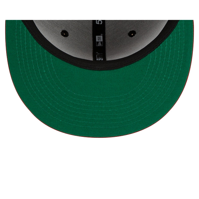 The Miami Heat Two-Tone Hoops 59FIFTY Fitted Cap features a team specific two-tone fabrication with a day of establishment graphic and Heat logo at the front panels and the NBA logo at the rear. Additional details include a Kelly Green undervisor.