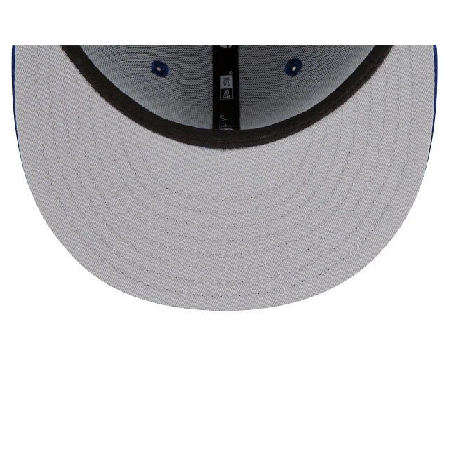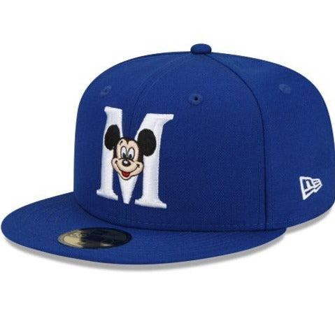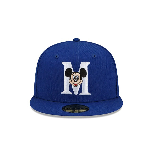 The Mickey Mouse Letterman Royal 59FIFTY Fitted Cap features a Mickey Mouse over an embroidered M at the front panels with a Mickey Mouse wordmark embroidered at the rear.