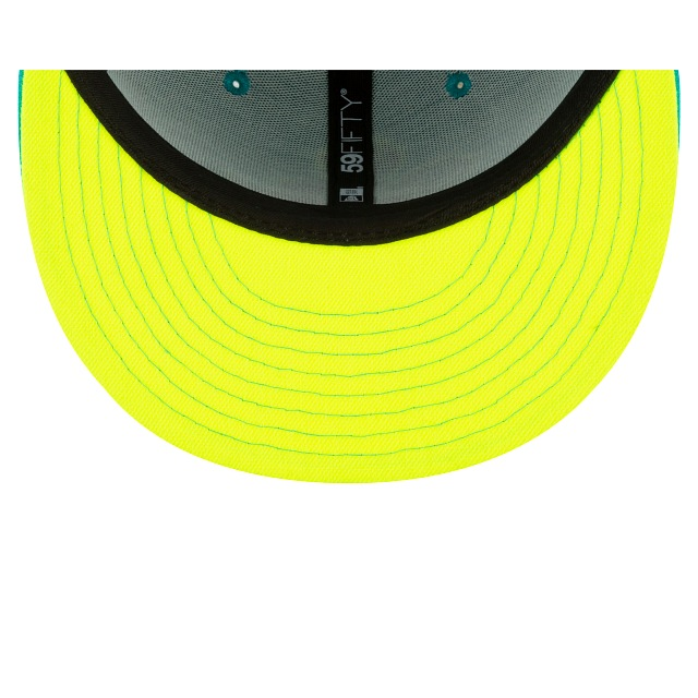 The Mickey Mouse Tropical 59FIFTY Fitted Cap features a teal fabrication with a tropical patterned Mickey Mouse cartoon at the front panels, a Mickey Mouse wordmark at the rear and a neon yellow undervisor.
