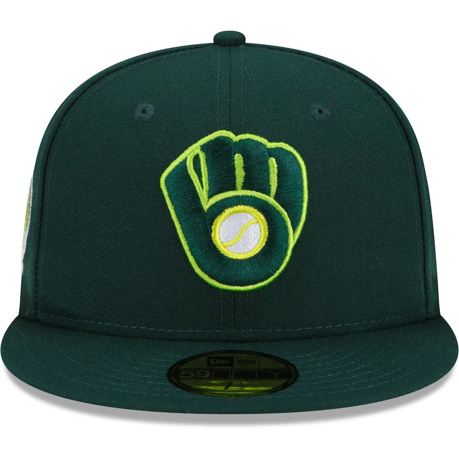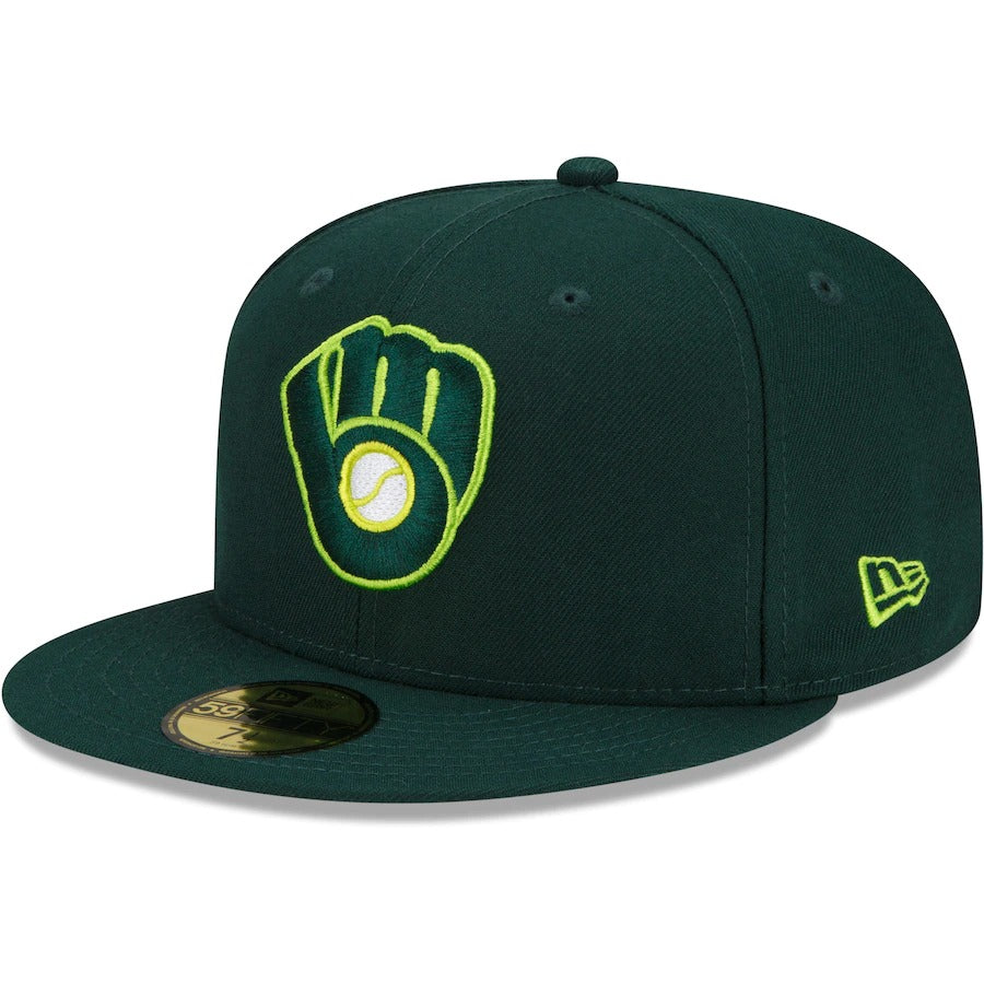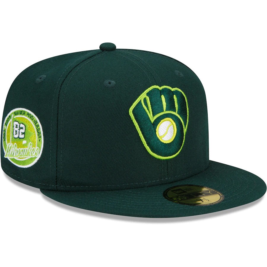 Take a unique approach to celebrating Milwaukee Brewers history with this Silver Anniversary Color Fam 59FIFTY hat by New Era. Its bright colorway features a lime undervisor that complements the team graphics. A fitted closure also ensures this Milwaukee Brewers cap always has a perfect fit.